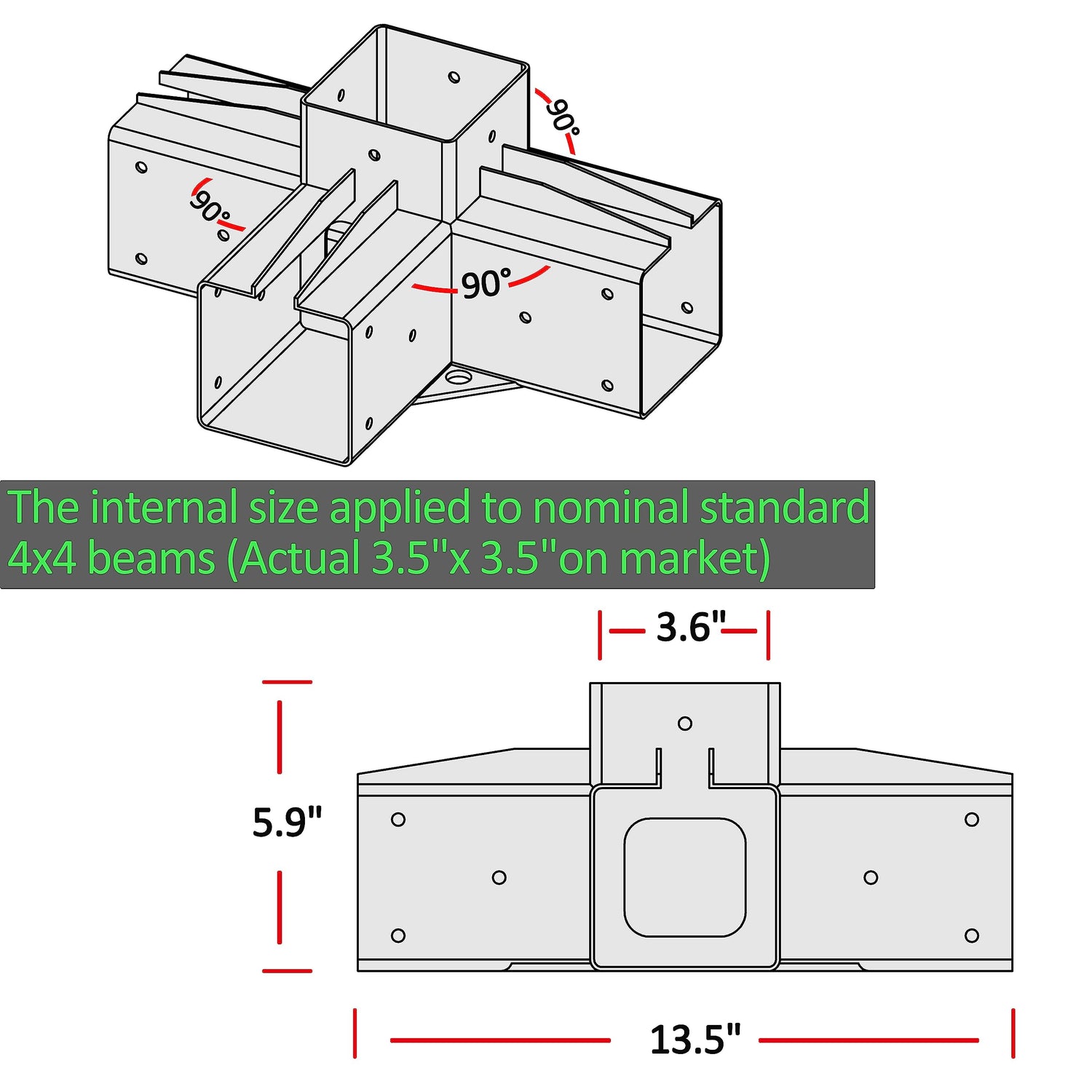 - Actual internal size:3.6×3.6inch, This size applies to nominal standard 4"x 4" wooden post (actual 3.5"x 3.5" lumbers on market); there is a slight error in the actual size, usually the error is about 1mm;Each angle of corner is 90 degrees;