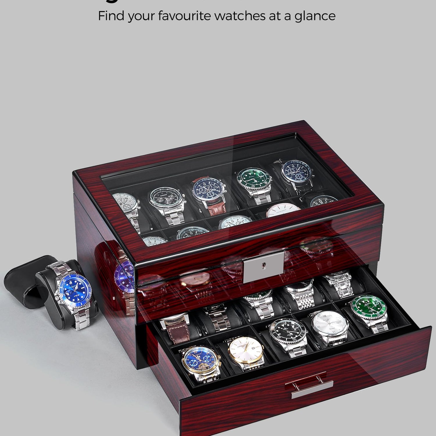 - WATCH CASE with GLASS LID and LOCK : You can stow away your watches and admire them at the same time through the transparent glass.And it can be placed in a well lit area without hindering the charging of your solar watch.The lockable feature offers peace of mind, ensuring that your watches are safely protected from unauthorized access