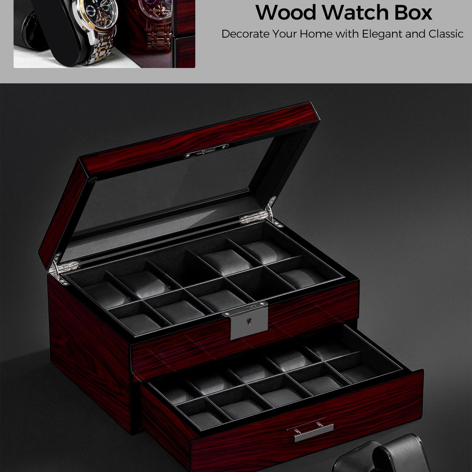 - ATTRACTIVE WATCH BOXES:The watch box's sleek and sophisticated design adds a touch of luxury to your watch collection, The wood grain and piano lacquer craftsmanship and super quality soft PU lining make it look luxurious and charming.The beautiful hardware buckle makes it more exquisite