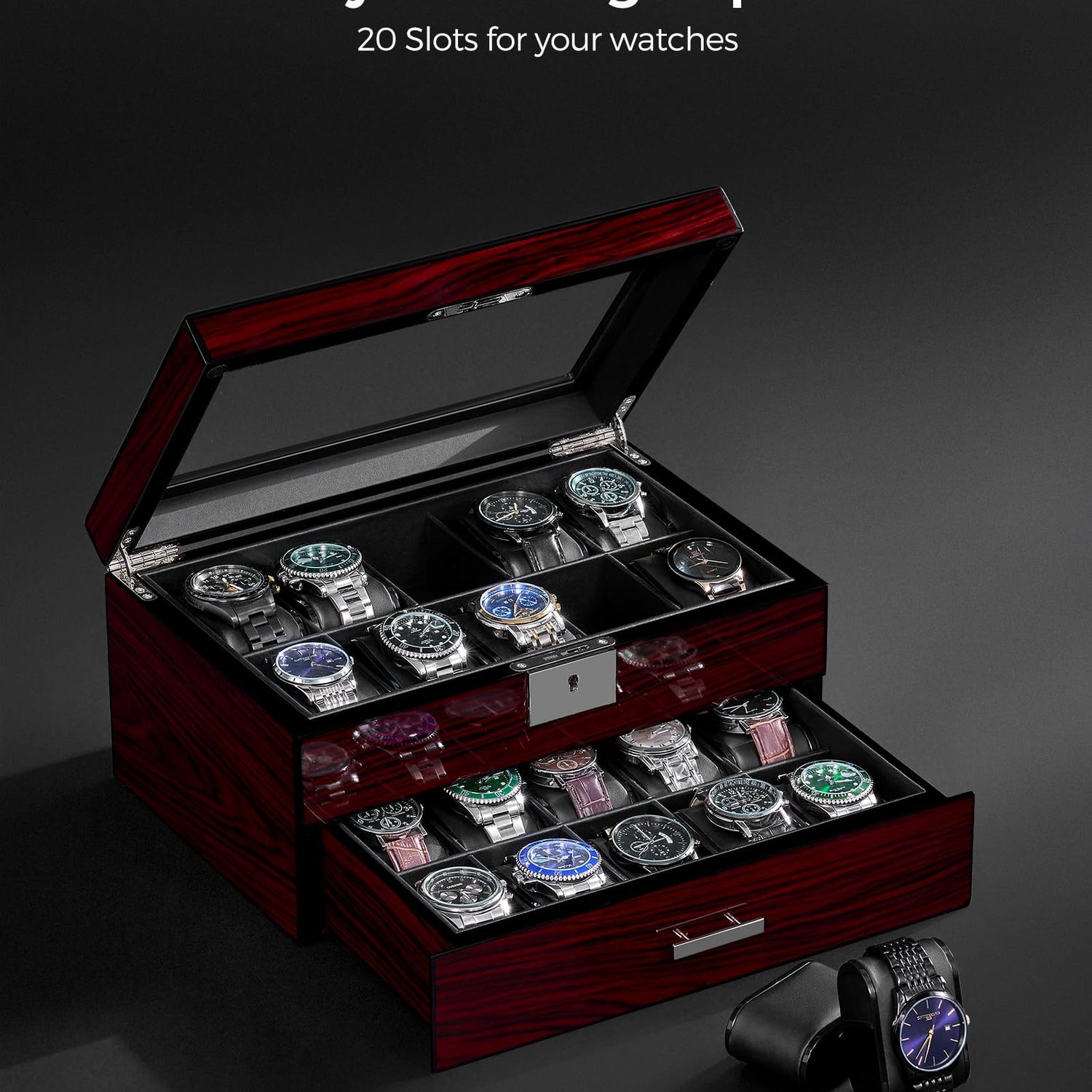 - 20 SLOT WATCH DISPLAY CASE: Watch box size: 11.9 "L x 8" W x 6 "H (30.2 x 20.3 x 15.3cm), watch pillow size: 2.8" L x 2 "W (7.2 x 5 cm).This men's watch case is made of wood has 20 watch slots on the upper layer, Jewelry compartments on the lower layer, and a large glass lid.It holds your watches collection very well and keeps your jewelry(chunky rings and bracelets and tie pins)organized.