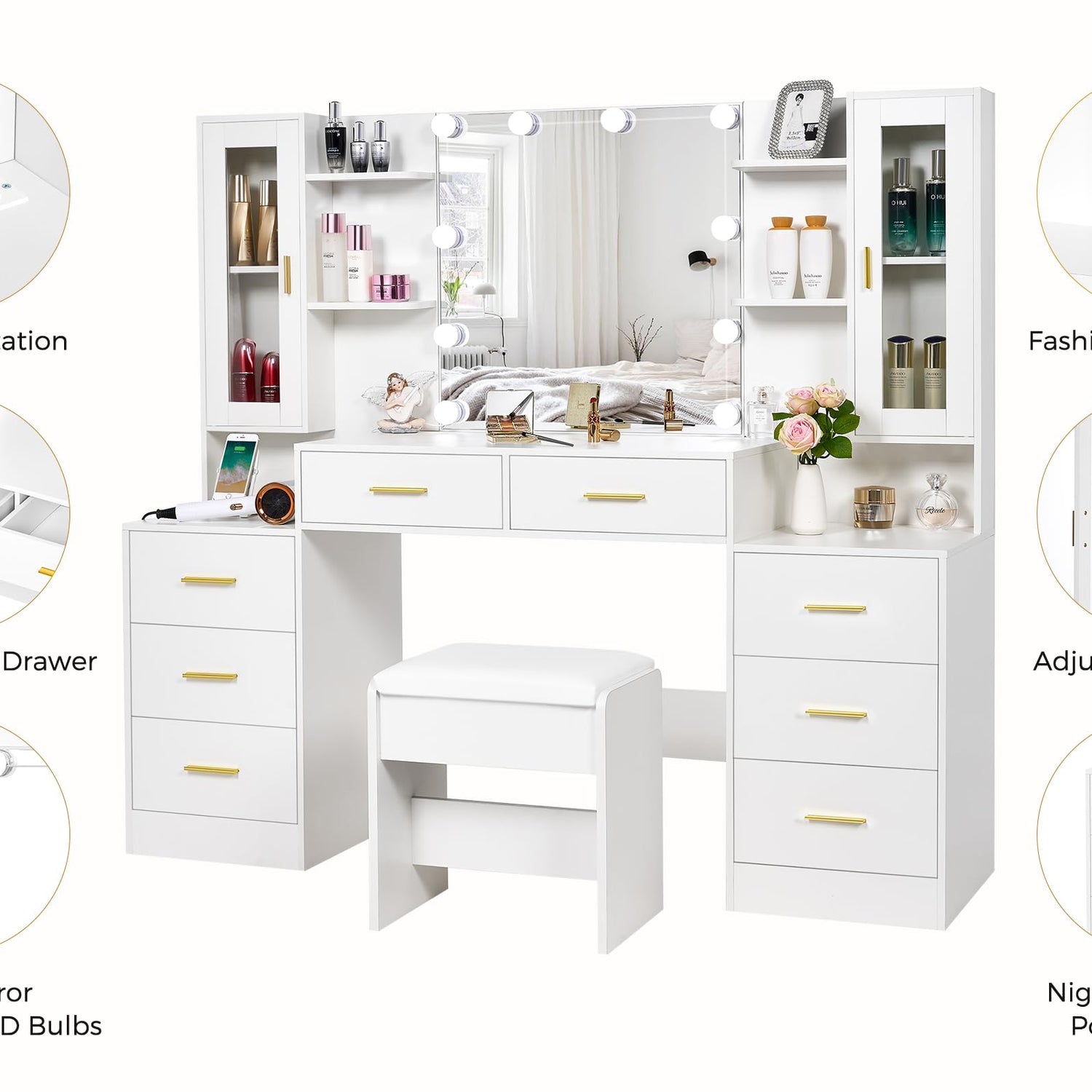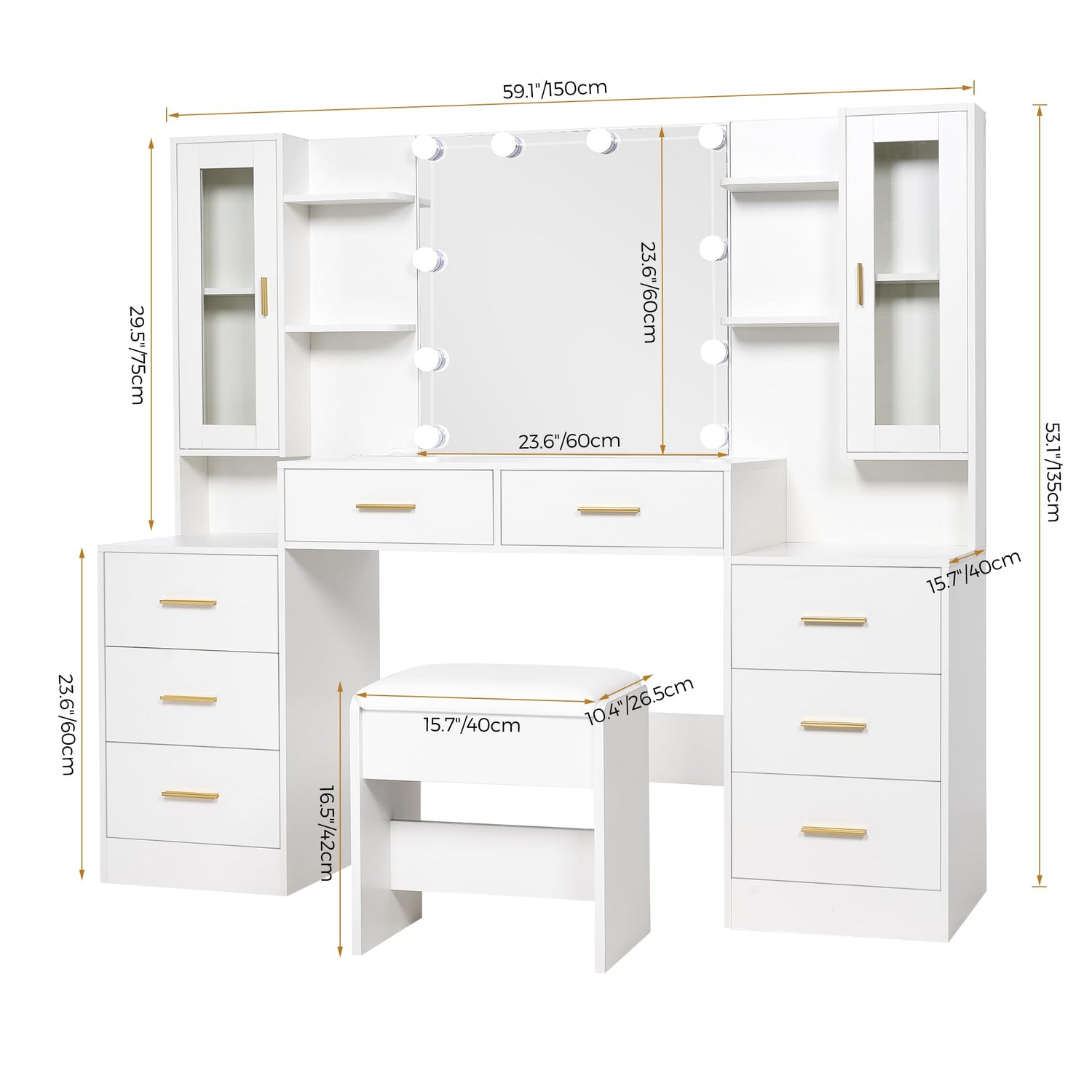 Details: ANWBROAD 59.1" Large Vanity Desk Table with Mirror & Lights White Makeup Vanity with Power Outlet and 8 Drawers 2 Cabinets 3 Lighting Modes Adjustable Vanity Table for Bedroom Dressing Room