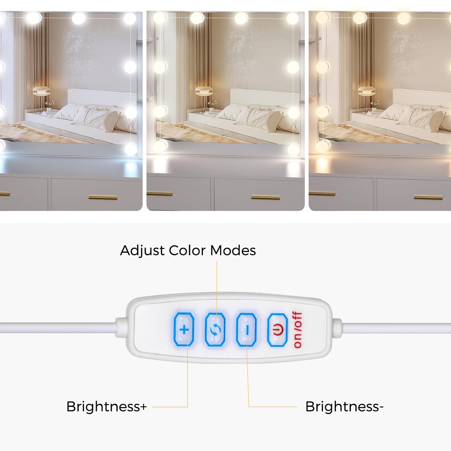 - 【VANITY DESK WITH LED LIGHTED MIRROR】This modern makeup vanity has an LED illuminated vanity mirror, which have adjustable brightness and 3 lighting modes. 10 LED dimmable bulbs provide your best beauty station with sufficient and adjustable brightness, by which you can view your makeup details in various lighting situations. LED lights also protect your eyes
