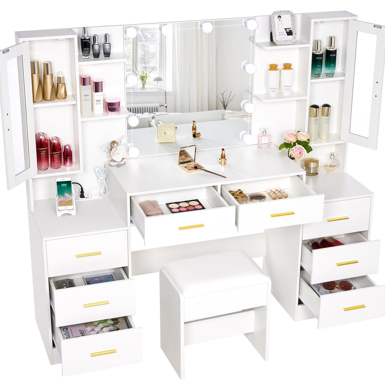 - 【LARGE VANITY TABLE WITH 8 DRAWERS】The vanity set also contains 8 drawer chests,6 Storage Shelves,2 storage cabinet and a large countertop. All your cosmetics and skin care products can be sorted and stored tidily to the vanity table. You can say goodbye to the small and messy table and having a better life with our vanity set