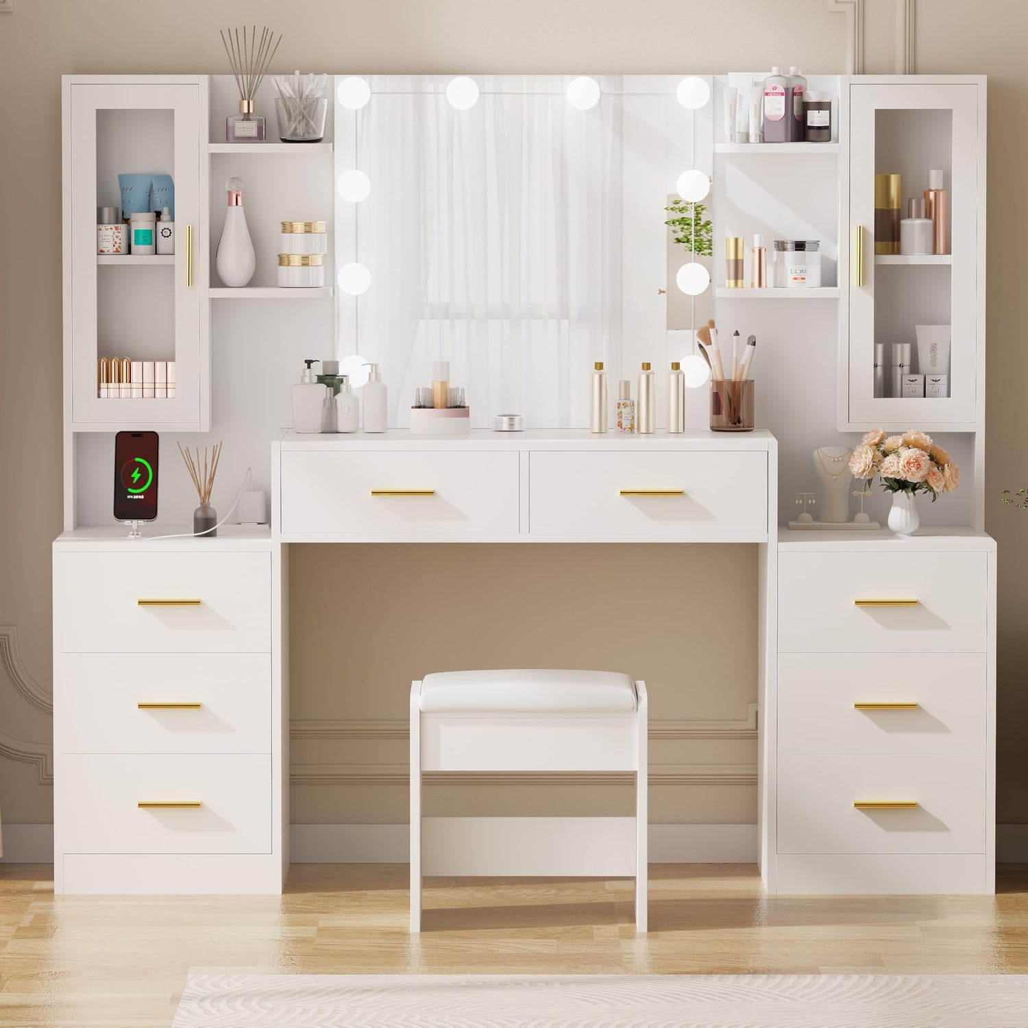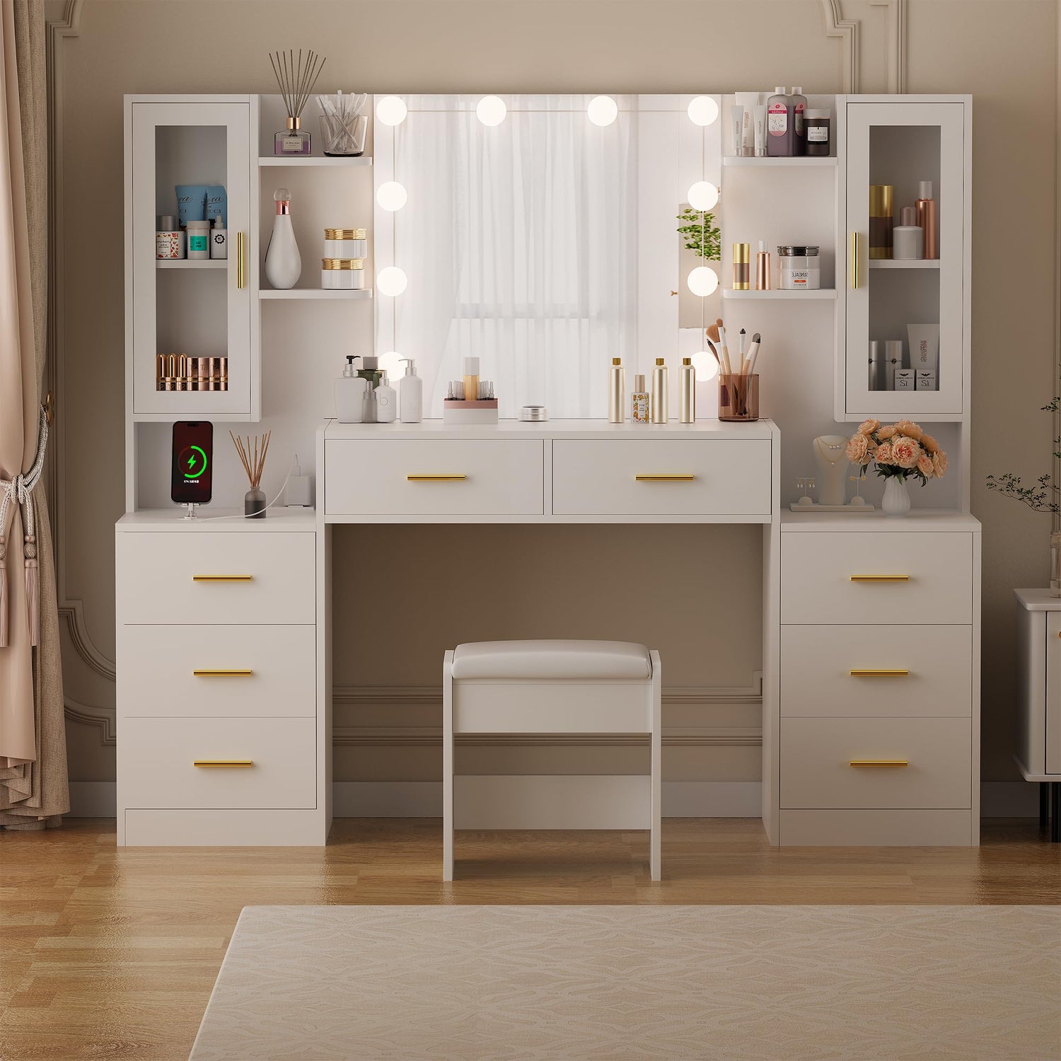 ANWBROAD 59.1" Large Vanity Desk Table with Mirror & Lights White Makeup Vanity with Power Outlet and 8 Drawers 2 Cabinets 3 Lighting Modes Adjustable Vanity Table for Bedroom Dressing Room UBDT67W