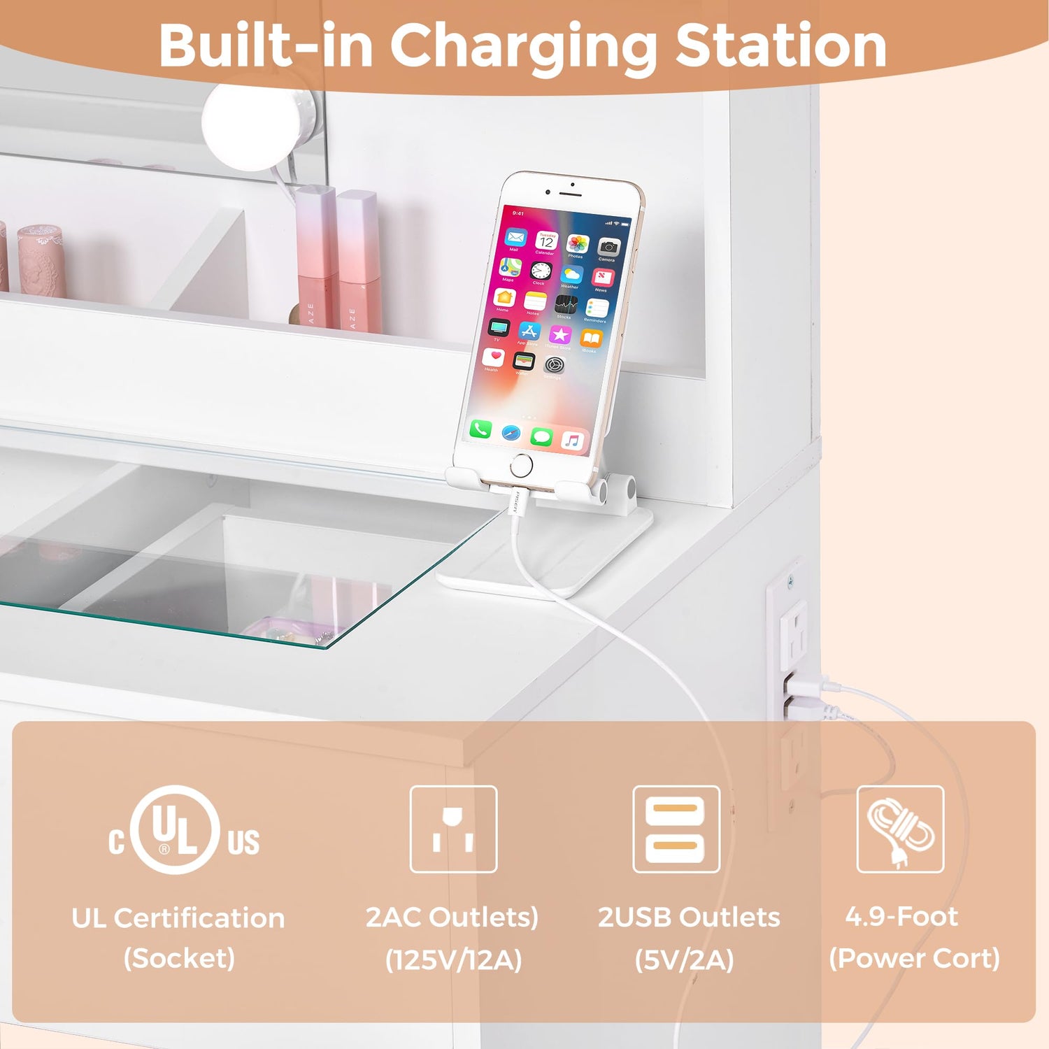 - EQUIPPED WITH CHARGING EQUIPMENT: Makeup vanity desk with lights comes with 2 standard power outlets and 2 USB ports; White vanity with charging station can charge hair dryers, beauty instruments and other electronic devices and makes your makeup more convenient and efficient