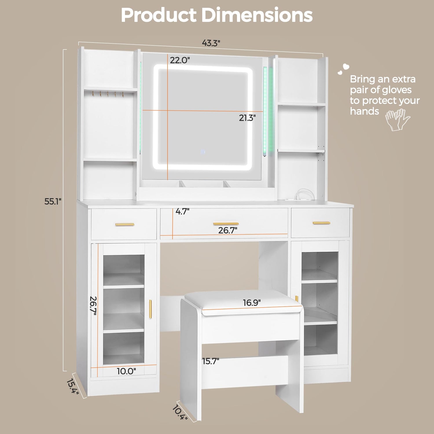 ANWBROAD Vanity Desk with Mirror and Lights 3 Colors 43.3" Makeup Vanity with RGB Lights and Power Strip Large Vanity Set with 3 Drawers 2 Cabinets White Dressing Table Stool for Women Bedroom UBDT78W
