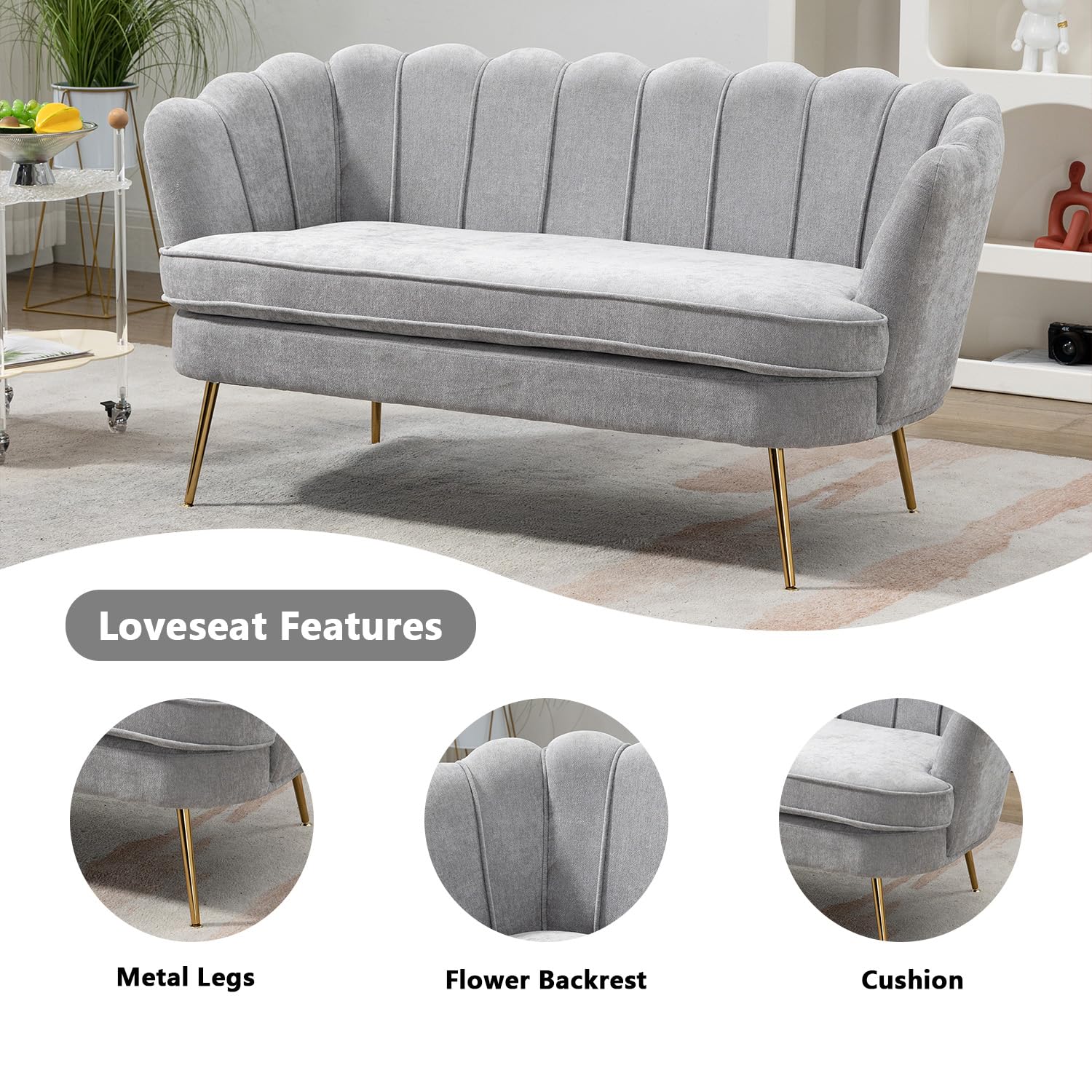 Anwick 59" Small Modern Chenille Loveseat Sofa, 2-Seater Sofa with Gold Metal Legs, Small Couch with Flower Shaped Back for Living Room Bedroom Office (Light Gray)