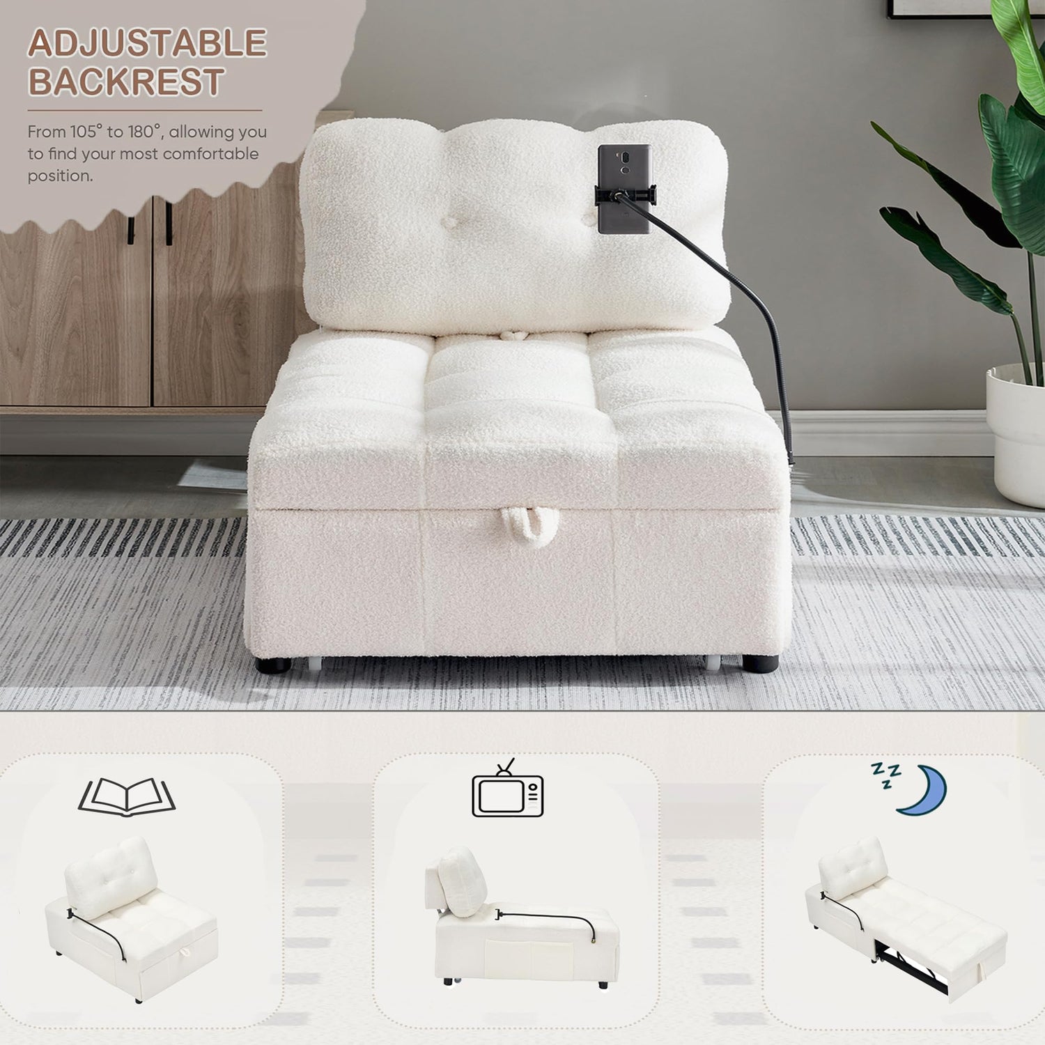 Anwick Modern 3 in 1 Teddy Fabric Sofa Bed Futon,Convertible Pull Out Bed Couches with Adjustable Backrests,Phone Stand,Single Sleeper Chair Bed for Small Living Room Bedroom (White)