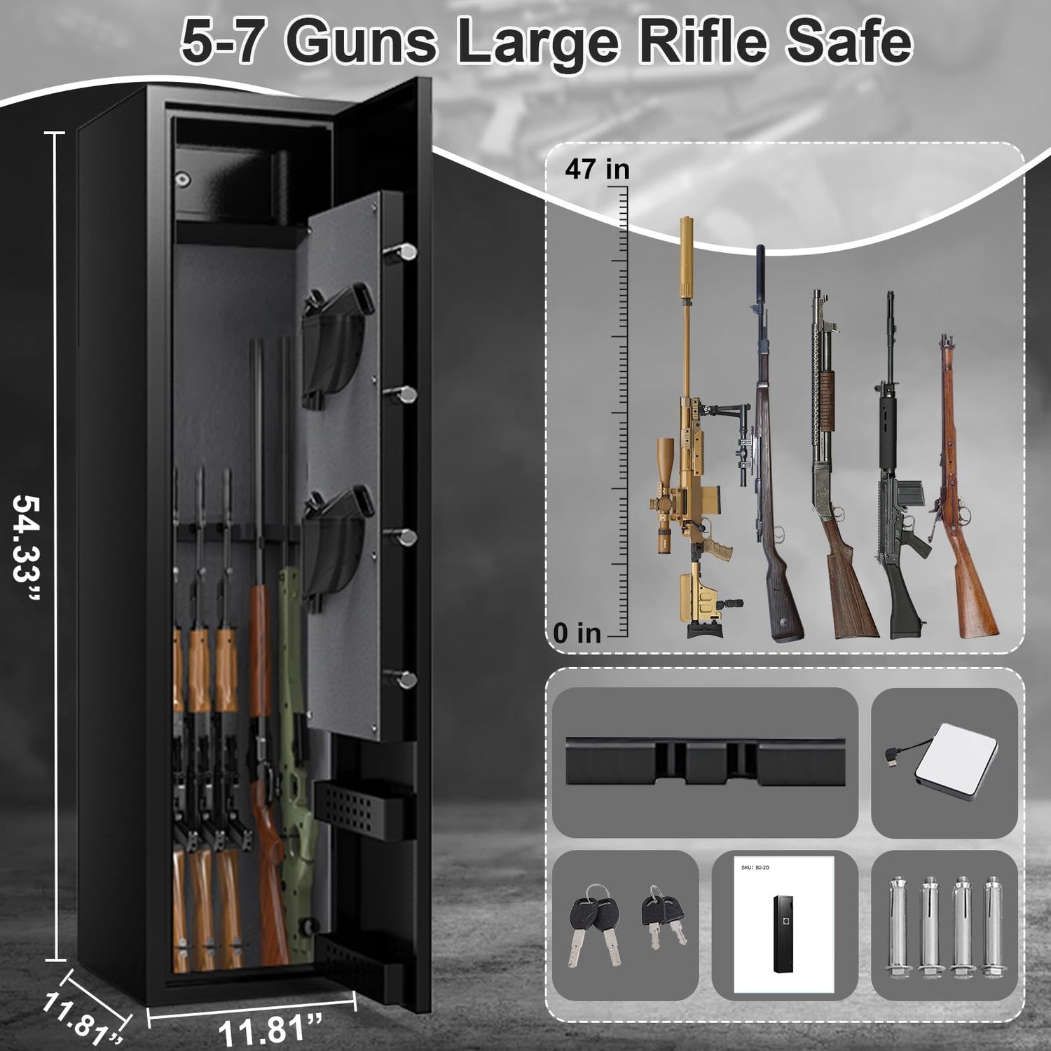 - 【EXTRA LOCKER RIFLE GUN SAFE】Top with Extra Locker, Double Space, Double Protection. This Gun Safe for Rifles can Accommodate 5-8 Rifles and 2 Handguns, Supporting Rifles Up to 47 Inches in Length. the LED Sensor Light Enables Quick Access to Your Firearms in Dark Environments. The interior Features a Removable Soft PVC Material Gun Rack and A Carpeted Floor to Protect Your Firearms. Exterior Dimensions of 11.81"D X 11.81"W X 54.33"H