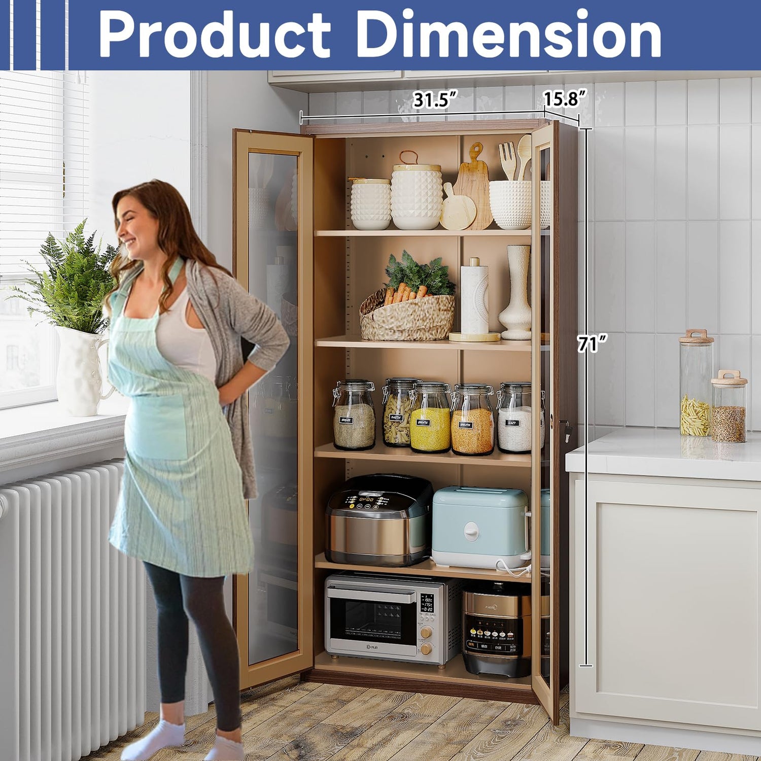 Anxxsu Display Cabinet with Glass Doors, Display Case Cabinet for Collectibles, Curio Display Cabinet with 4 Adjustable Shelves, 71" Glass Display Cabinet for Home Living Room (Wood Color)