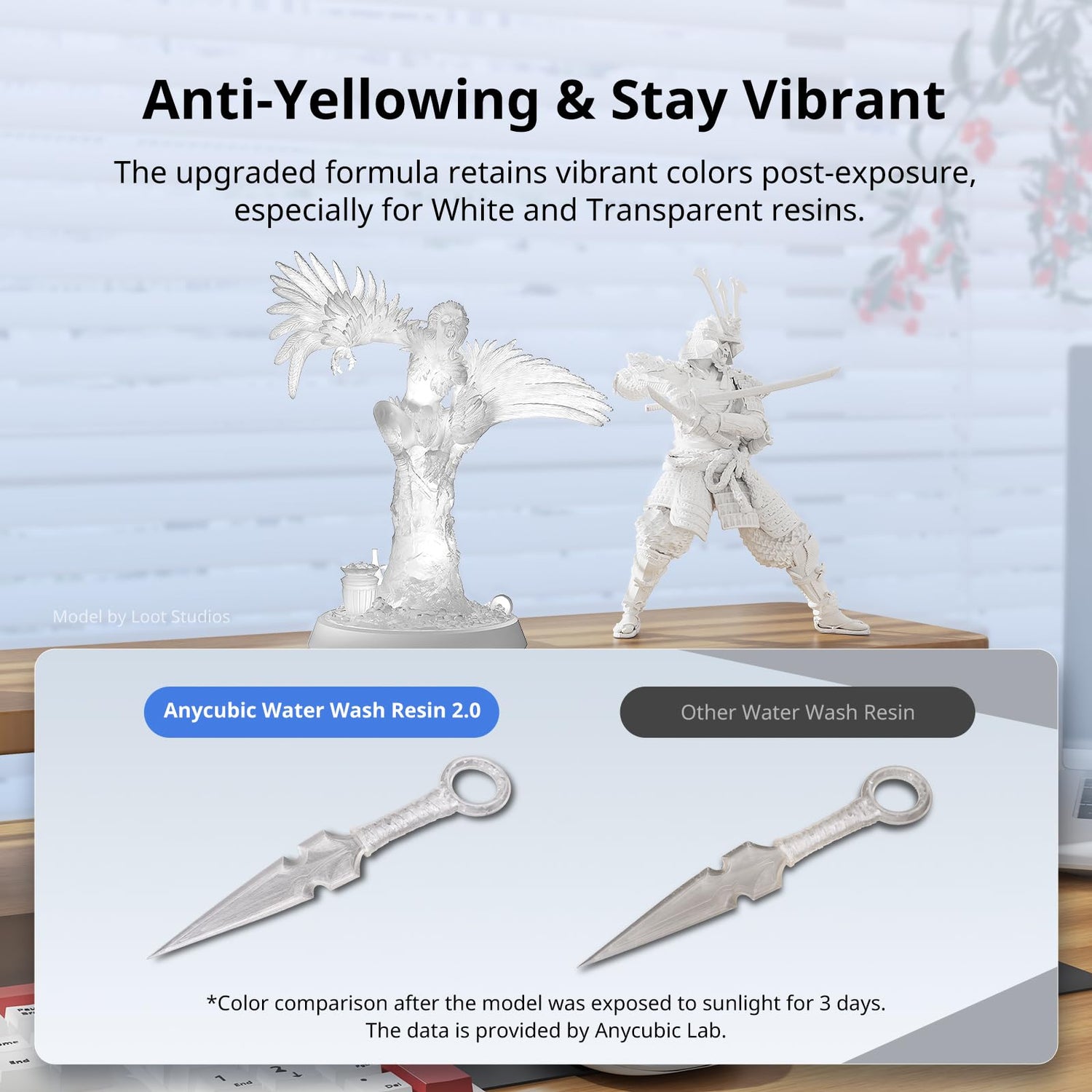 - 【Water Washable Resin 2.0】 Compared to traditional alcohol wash resin, the prints by ANYCUBIC Water Washable 3D Printer Resin can be super easy to clean by water instead of alcohol and greatly save the cost of alcohol use.