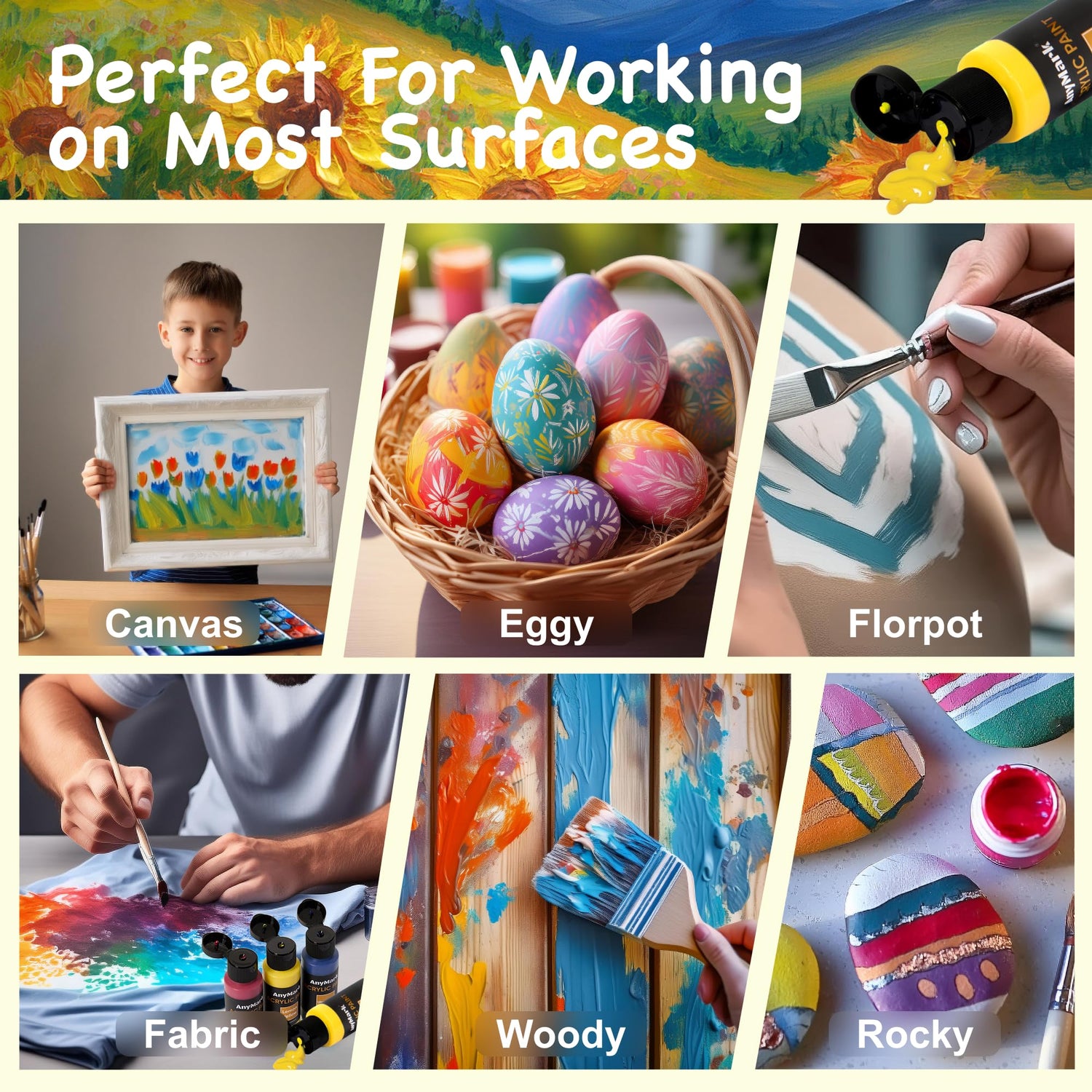 - Wide Application - Quick-drying, waterproof, and fade-resistant, AnyMark acrylic paint is versatile and suitable for a variety of surfaces, including canvas, rocks, glass, walls, wood, fabric, ceramic, clay, plastic, and more. Every surface is a playground for your boundless imagination!