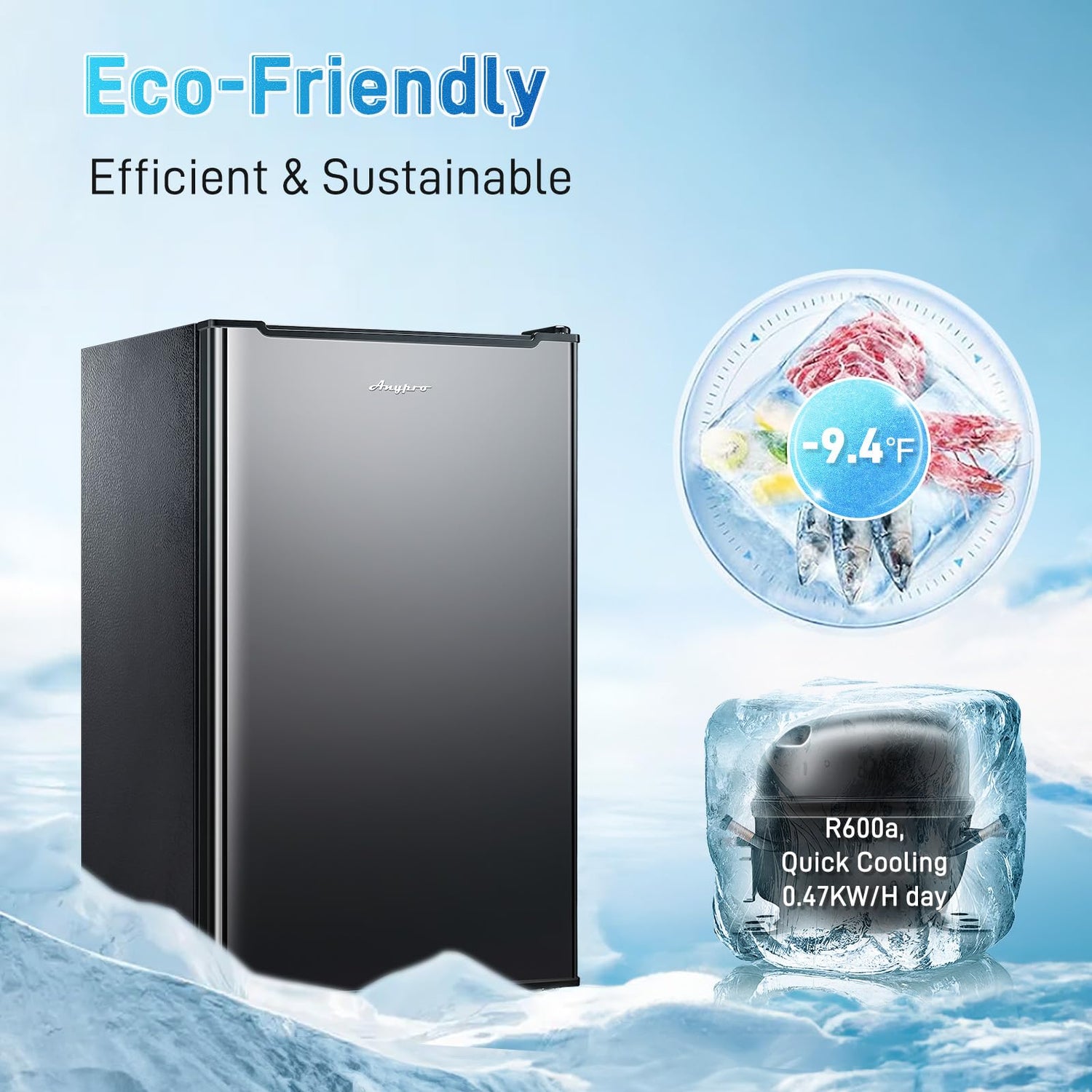 - [Portable, Compact & Large Capacity] Anypro compact freezer with a small footprint of only 18.5'' x 17.52'' x 32.87'', making it an ideal choice for those who need extra freezer space without taking up too much space, such as renters and students. Perfect for dorms, RVs, apartments, garages or offices. With a large internal capacity of 3 Cu.Ft and multi-layer construction, small freezer upright can meet your daily food and beverage storage needs. Just plug it in and start preserving food.