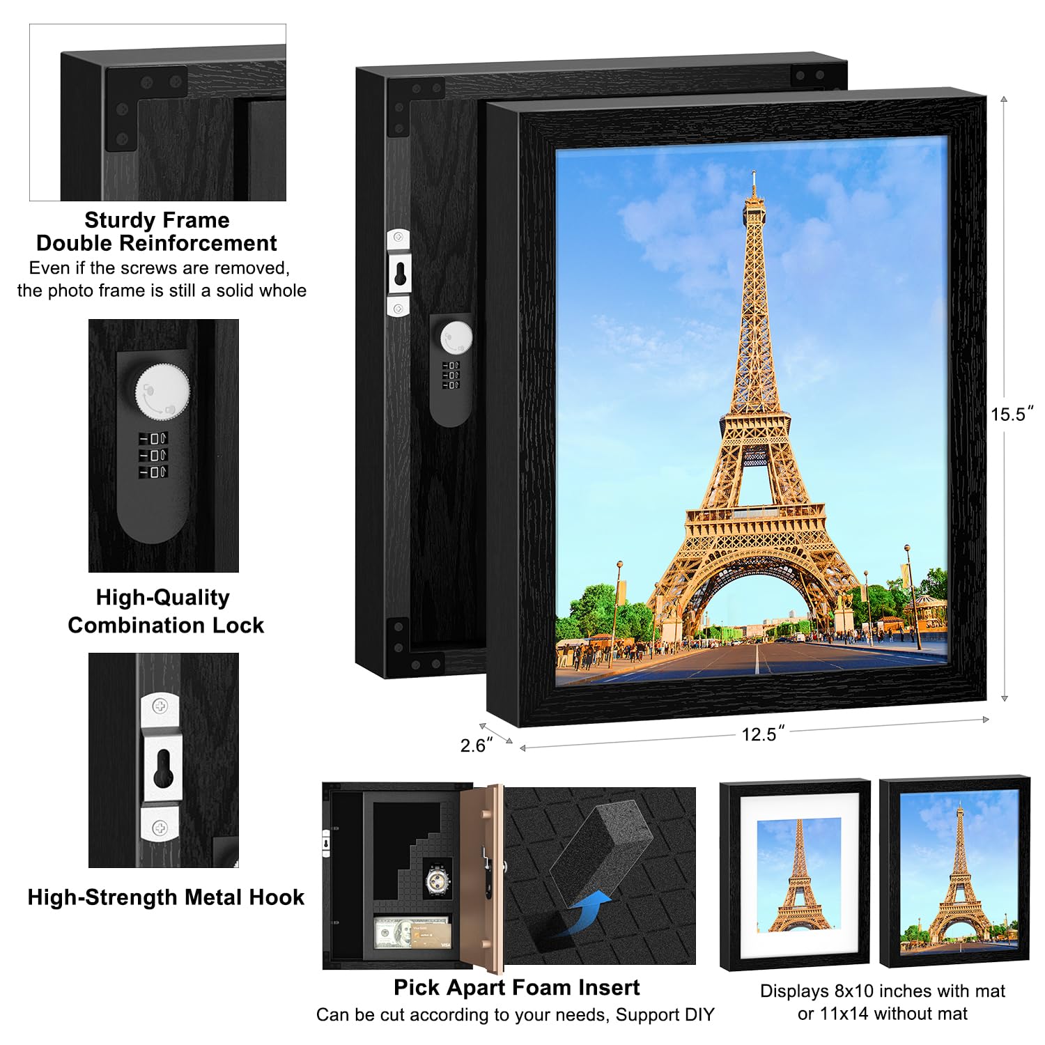 ANZAKY Hidden Safe with Lock, Wooden Picture Frame Diversion Safe, Large Hidden Money Safe with Customizable Foam, Hidden Compartment, Secret Decor Concealment Furniture, 11 x 14 inchs, Black