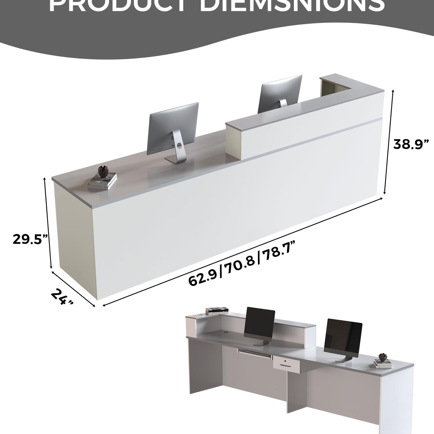 Anzhap L-Shaped Reception Desk with Counter, Front Desk Reception Counter with Drawer, Keyboard Tray & Cable Box for Office, Salon, Lobby, Checkout, Retail(White + Grey/Left, 63" L * 24" W * 39" H)