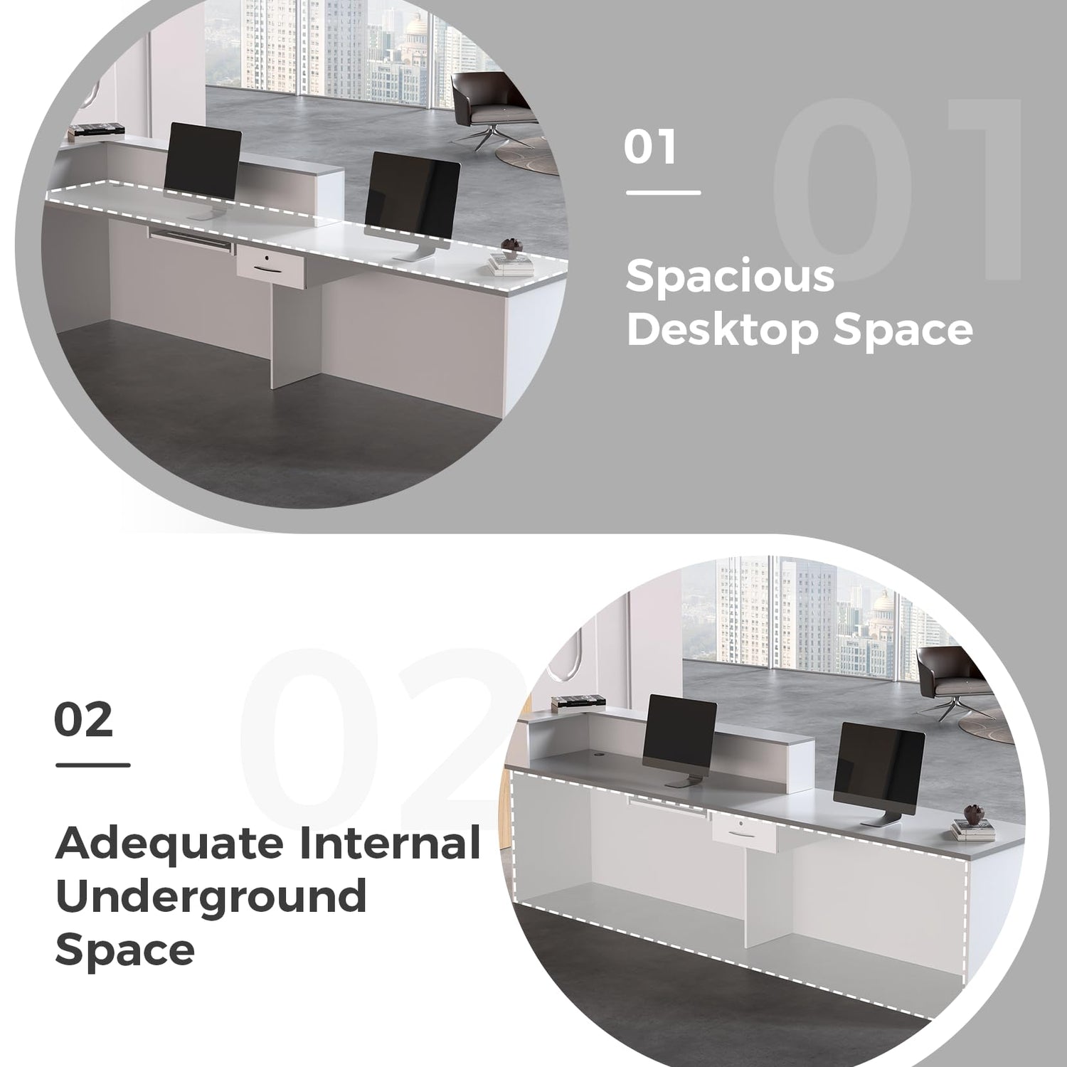 - ใ๐ข๐ฟ๐ด๐ฎ๐ป๐ถ๐๐ฒ๐ฑ ๐๐ฎ๐ฏ๐น๐ฒ๐ & ๐ฃ๐ฟ๐ถ๐๐ฎ๐ฐ๐ ๐ฃ๐ฟ๐ผ๐๐ฒ๐ฐ๐๐ถ๐ผ๐ปใIntegrated cable management with a built-in cable box keeps cords hidden, ensuring a clean and professional front desk. The widened double tabletop and raised modesty panel provide extra workspace while protecting privacy during interactions