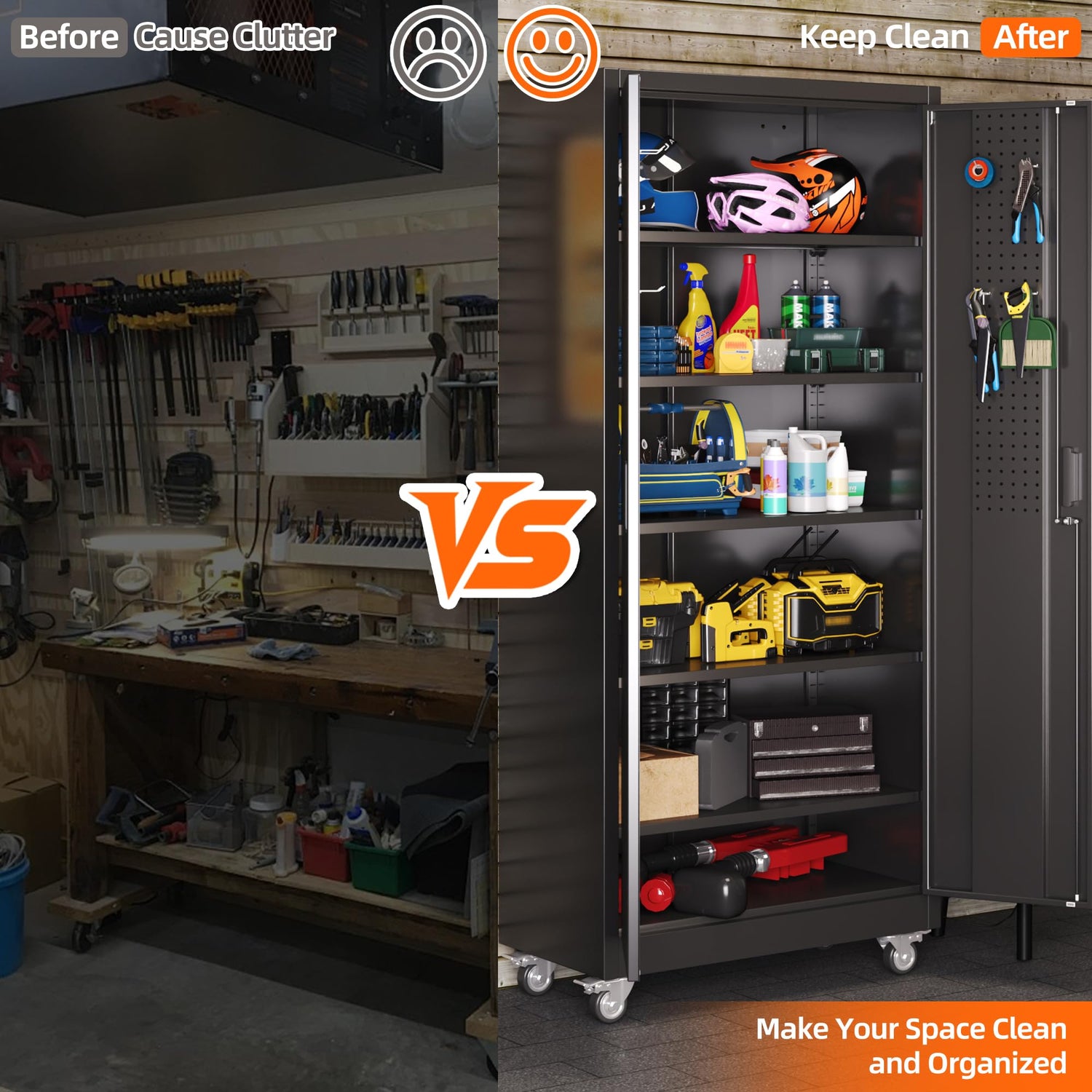 - Universal Rubber Wheels: Metal garage cabinet with wheels comes with 4 lockable universal silent casters, providing full protection for all surfaces from scratch yet easy to move around