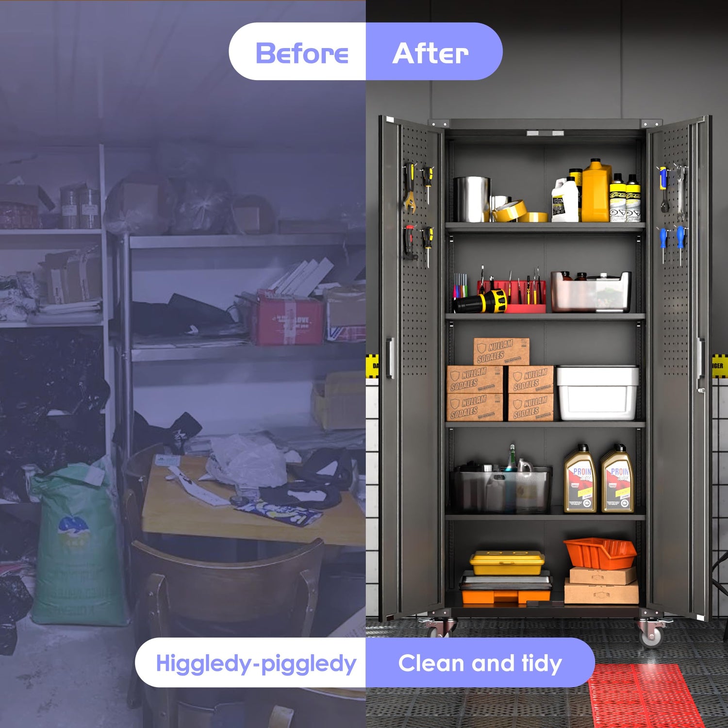 Aobabo 72" H Metal Storage Cabinet with Wheels for Garage, Locking Metal Storage Cabinet with 4 Shelves and 2 Pegboards, Rolling Tool Storage Cabinet on Wheels, Black, Assembly Required