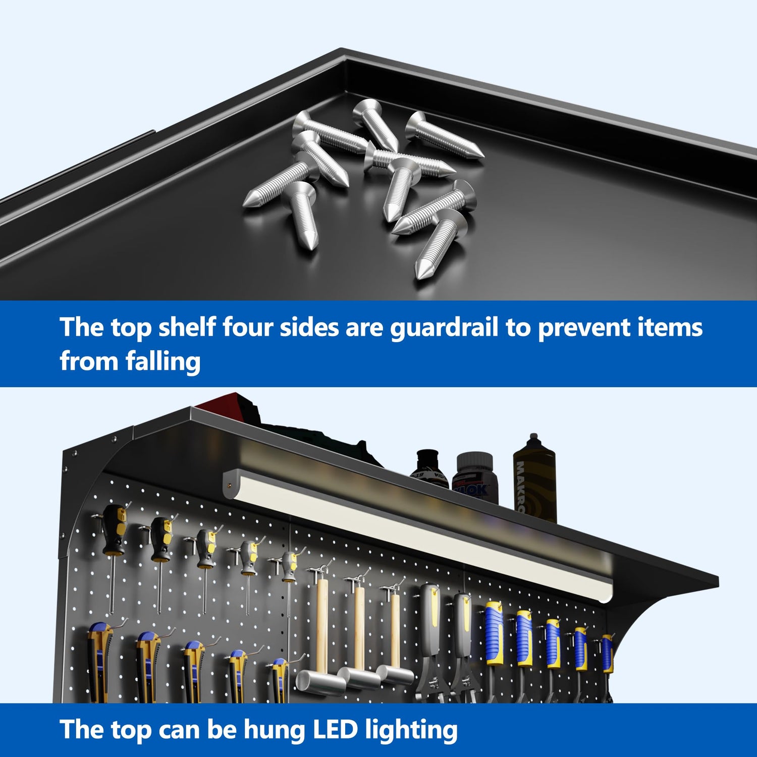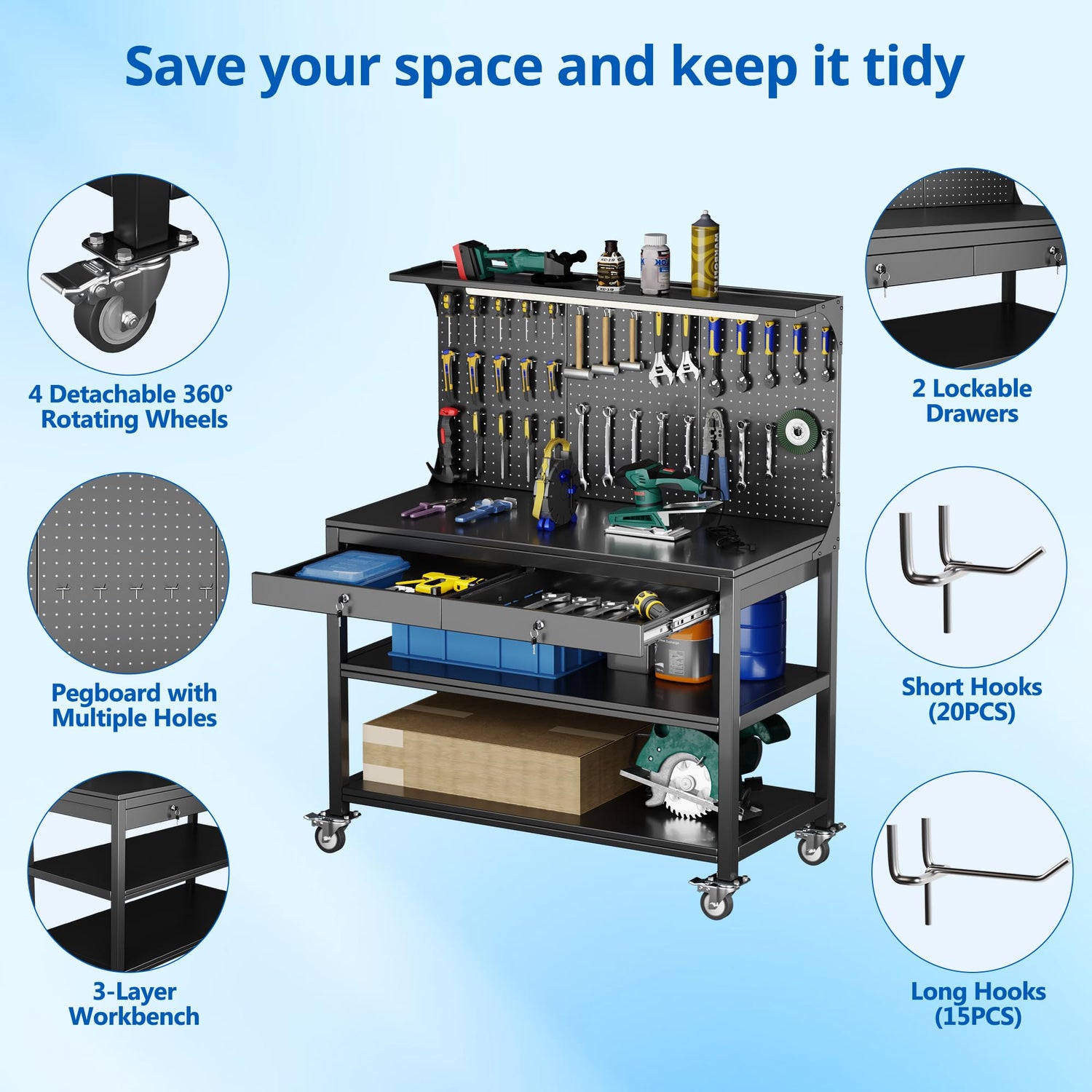 - 【Efficient Storage Solutions】To keep your tools organized, we provide 20 short hanging hooks and 15 long hanging hooks , three work surface, a big perforated pegboard and 2 drawers. This comprehensive storage setup ensures that all your tools are neatly arranged, easily accessible, and promotes efficient workflow, allowing you to complete your tasks quickly.