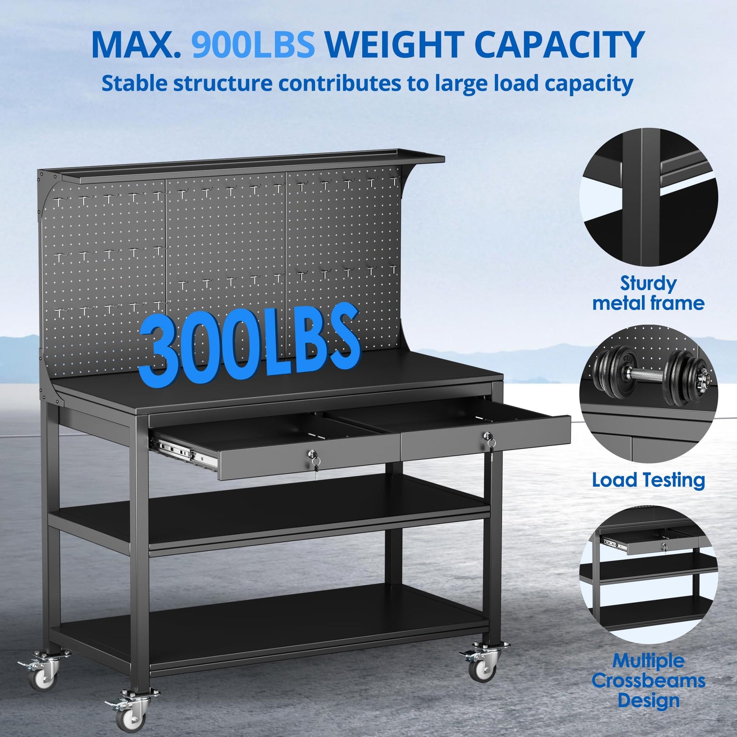 - 【Multifunction Bench】Metal work bench table with 2 Lockable Drawers &Pegboard &Wheels&35 Hooks, H59.1"*W47.24"*22.84. Steel tube legs on wheels meet your daily work needs.