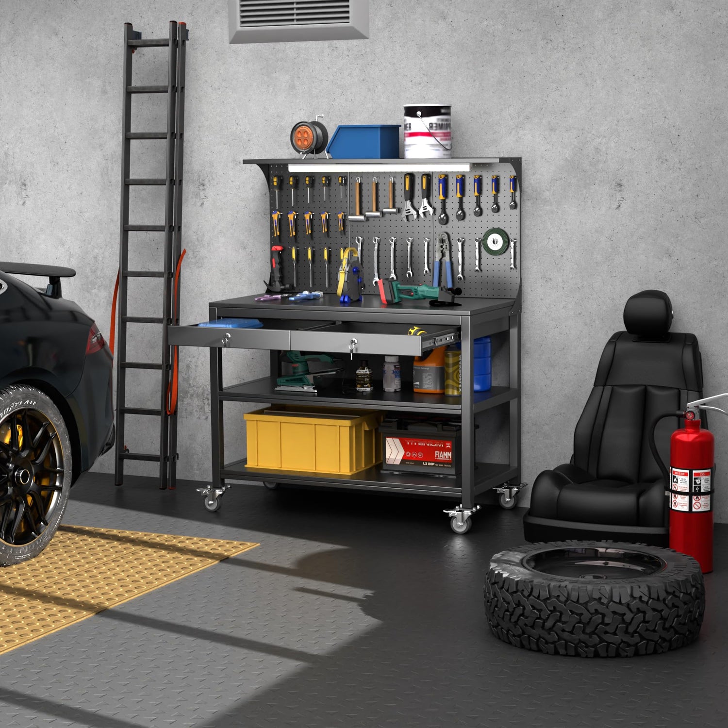 Aobabo Metal Workbench with 2 Lockable Drawer, Steel Tube Legs Workbench on Wheels, 3 Levels Workbench with Pegboard &35 Hooks for Garage Warehouse Utility Room, Black Tool Bench, Assembly Required
