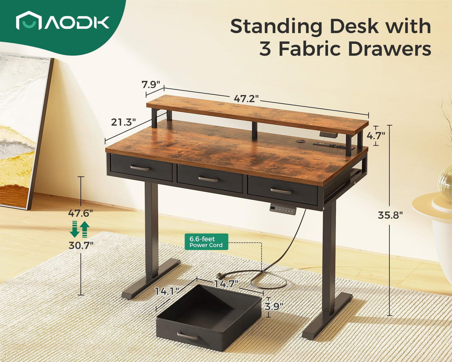 - 3 Cloth Drawers: AODK height adjustable desk offers vast storage space for office accessories within easy reach in home office time. Also, these drawers' iron structures can save installation time by reducing 80% of the assembly steps.