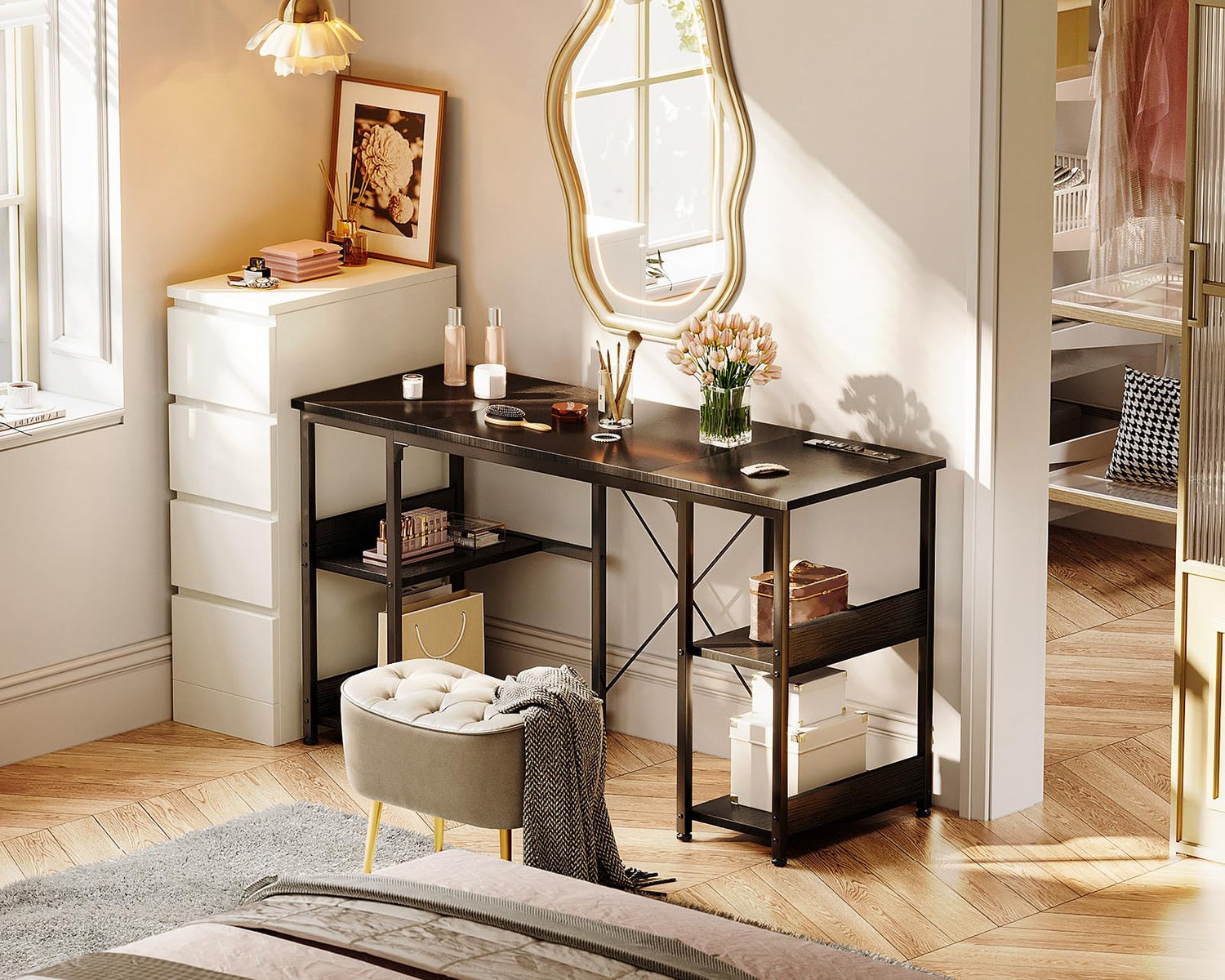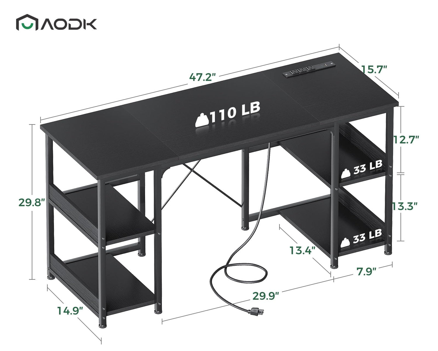 AODK 48 Inch Small Computer Desk with Power Outlets & Type-C, Home Table with Storage Shelves, Student Laptop PC Desks for Small Spaces Home Office Writing Desk, Kids Desk, Black
