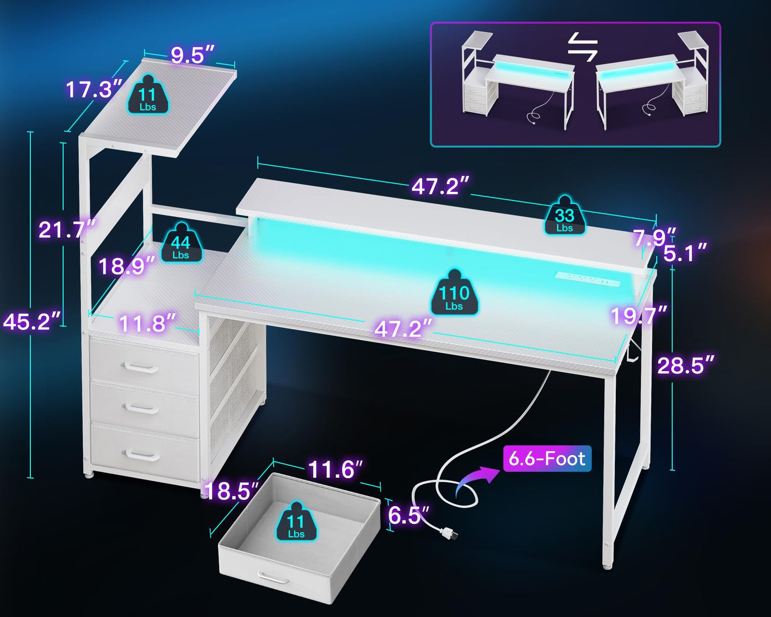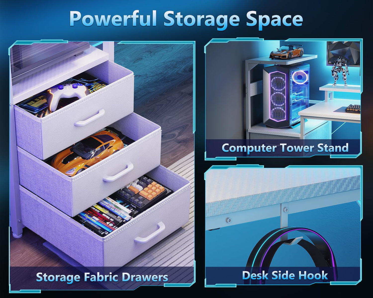 AODK 59 Inch Gaming Desk with USB Charging Ports & LED Light- Reversible Computer Desk with Storage Shelves & Monitor Stand, Modern Gamer Desk Table with Fabric Drawers & Side Hook, Carbon Fiber White