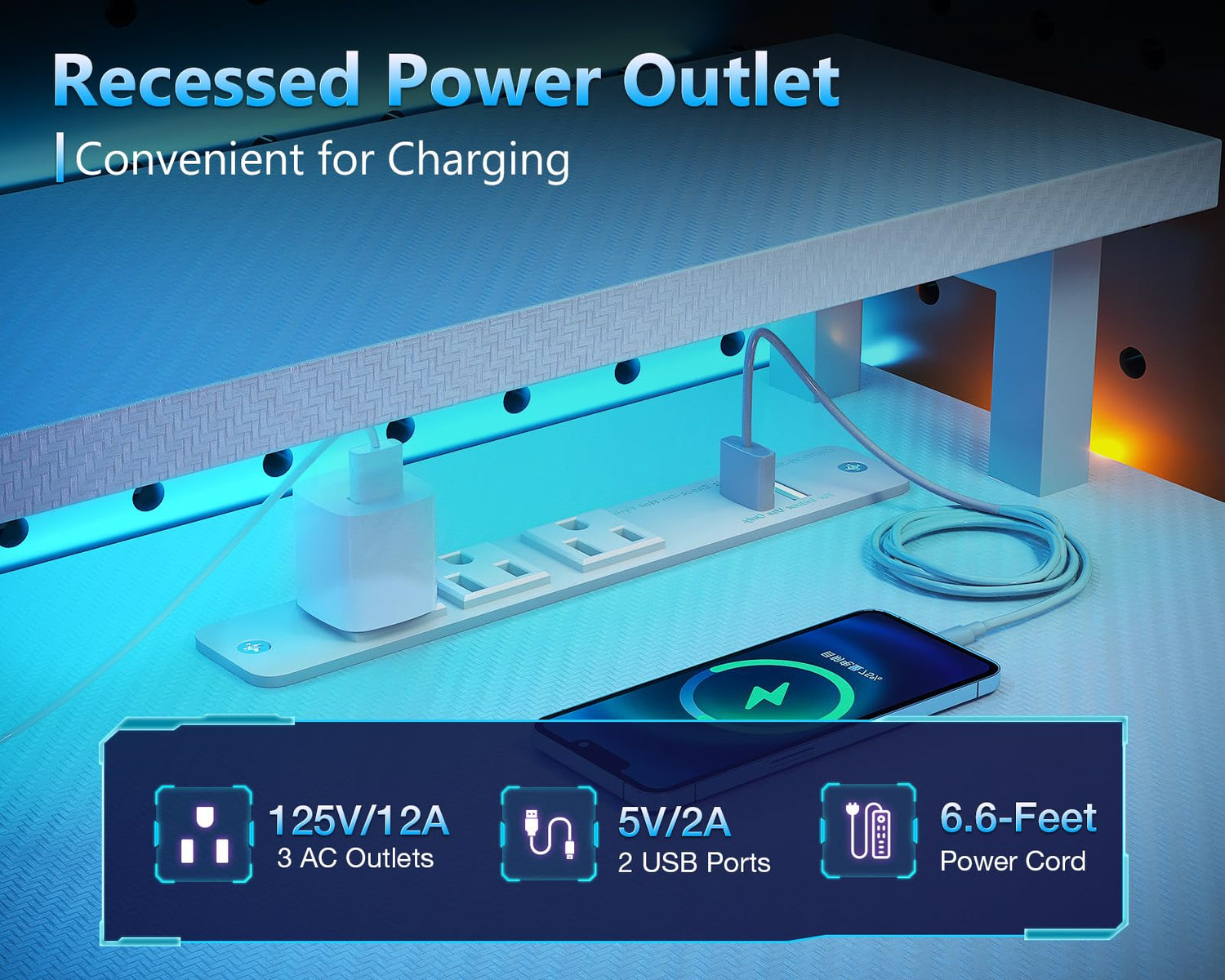 - 【USB Charging Ports & Power Outlets】The computer desk is equipped with 3 power outlets and 2 USB charging ports for your electronic devices, you can easily charge up to 5 electronic devices such as smartphones, gaming gear, and Bluetooth devices while working, studying, or playing games. Let this computer desk add more convenience to your life!