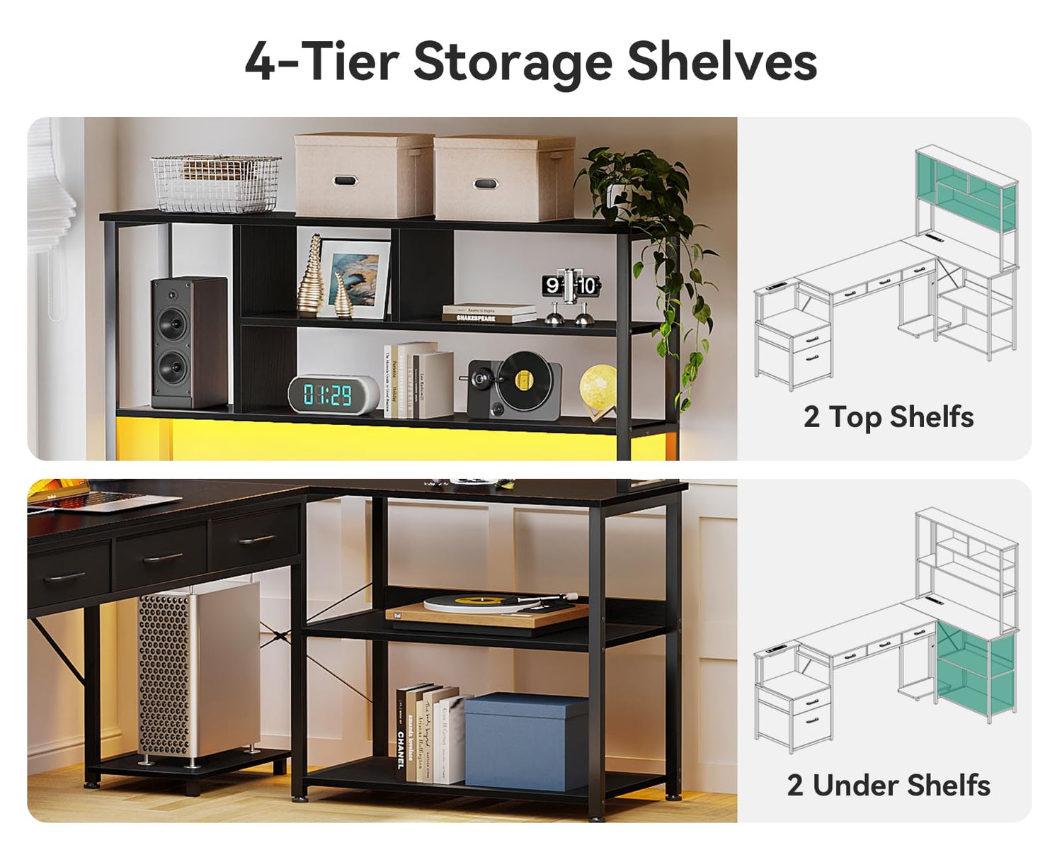 - 【What You get】AODK L-shaped desk provides 1 led light, 2 power outlets, 4 Tier open shelfs, 5 fabric drawers and CPU stand. The open shelfs can store your frequently used items and decorations, and the drawers can store sundries and office documents to meet your different daily storage needs.
