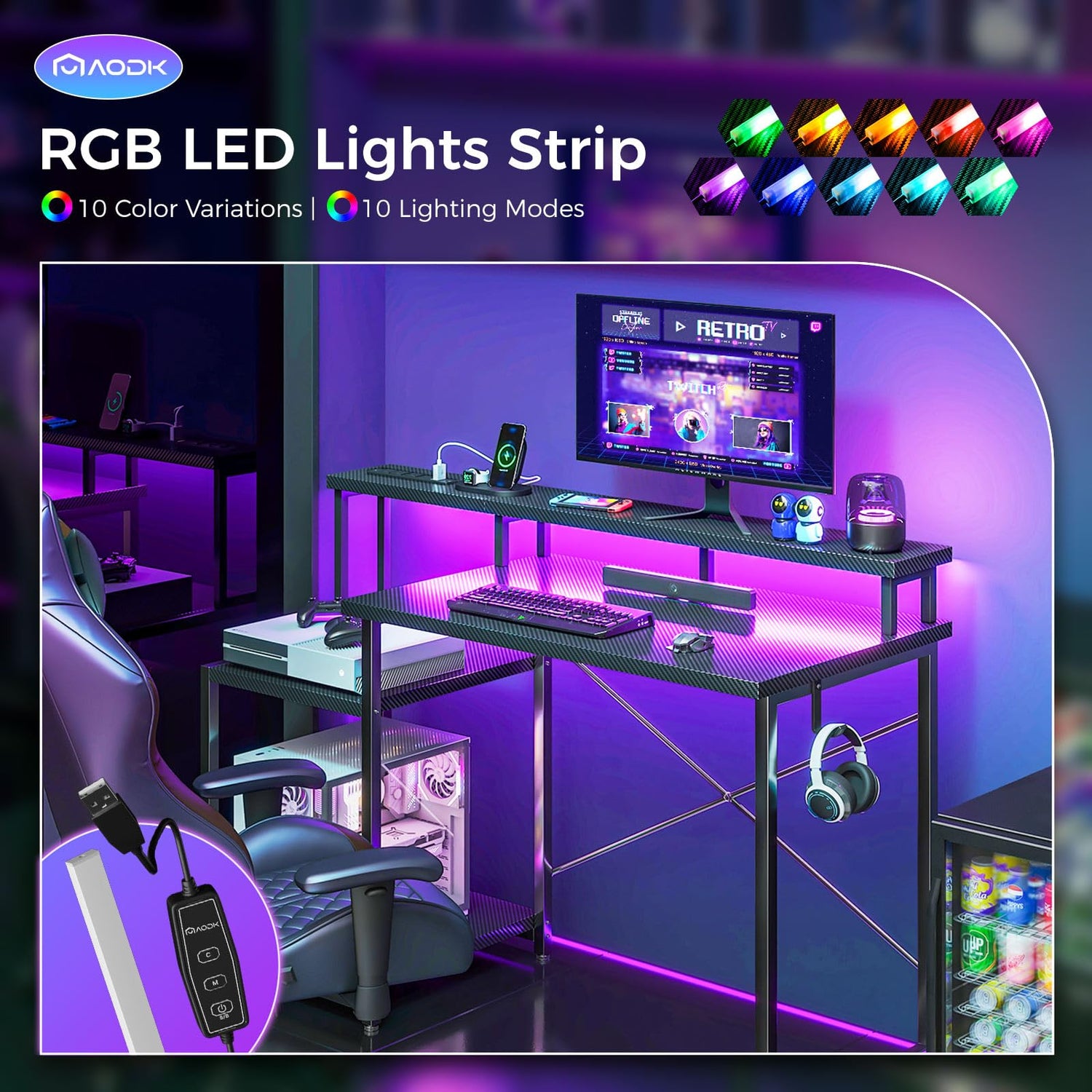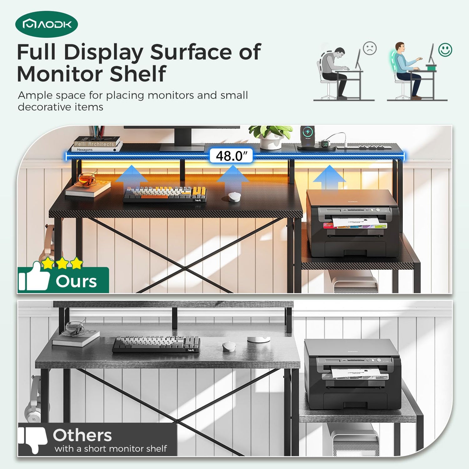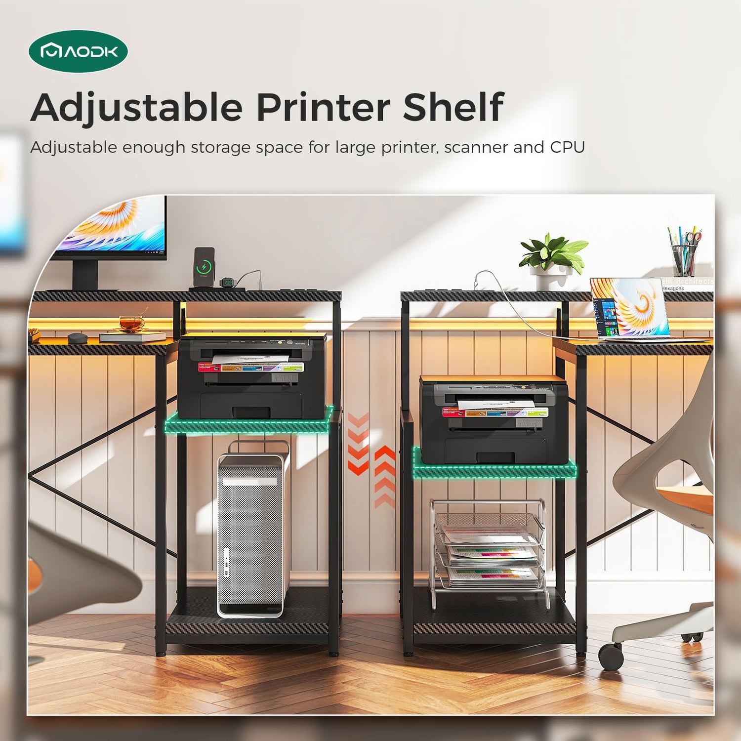 AODK Computer Desk, 48 Inch Gaming Desk with Led Lights & Power Outlet, Office Desk with Printer Storage Shelves, Reversible Desk with Monitor Shelf & Headphone Hook, Carbon Fiber Black