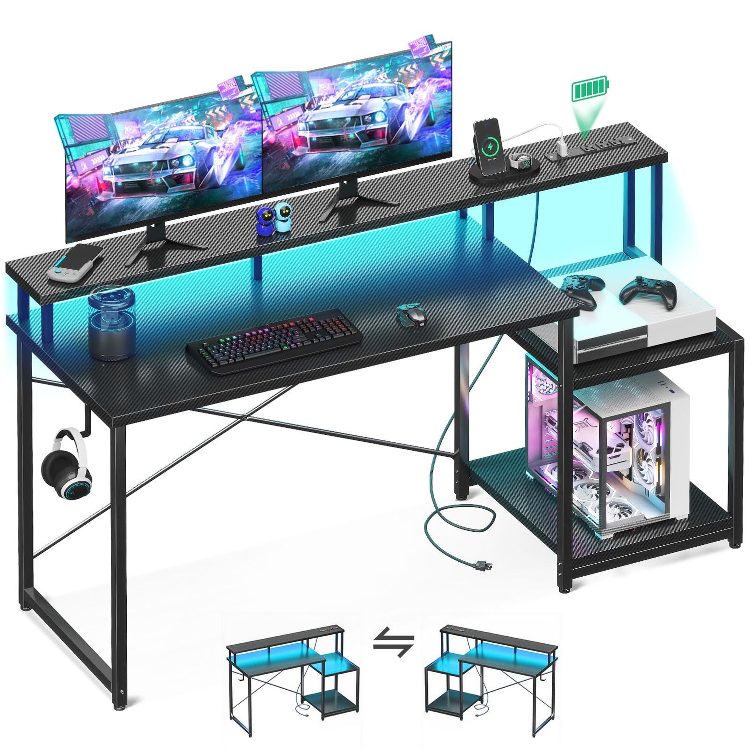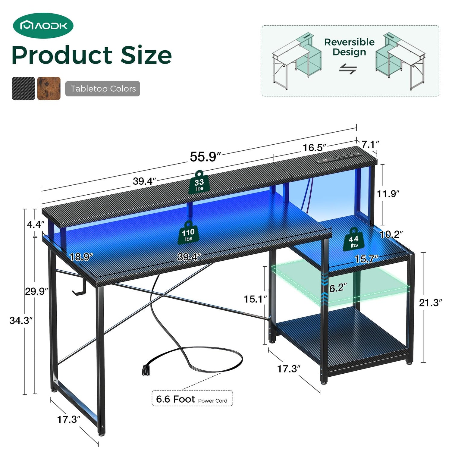 AODK Computer Desk, 56 Inch Gaming Desk with Led Lights & Power Outlet, Office Desk with Printer Storage Shelves, Reversible Desk with Monitor Shelf & Headphone Hook, Carbon Fiber Black