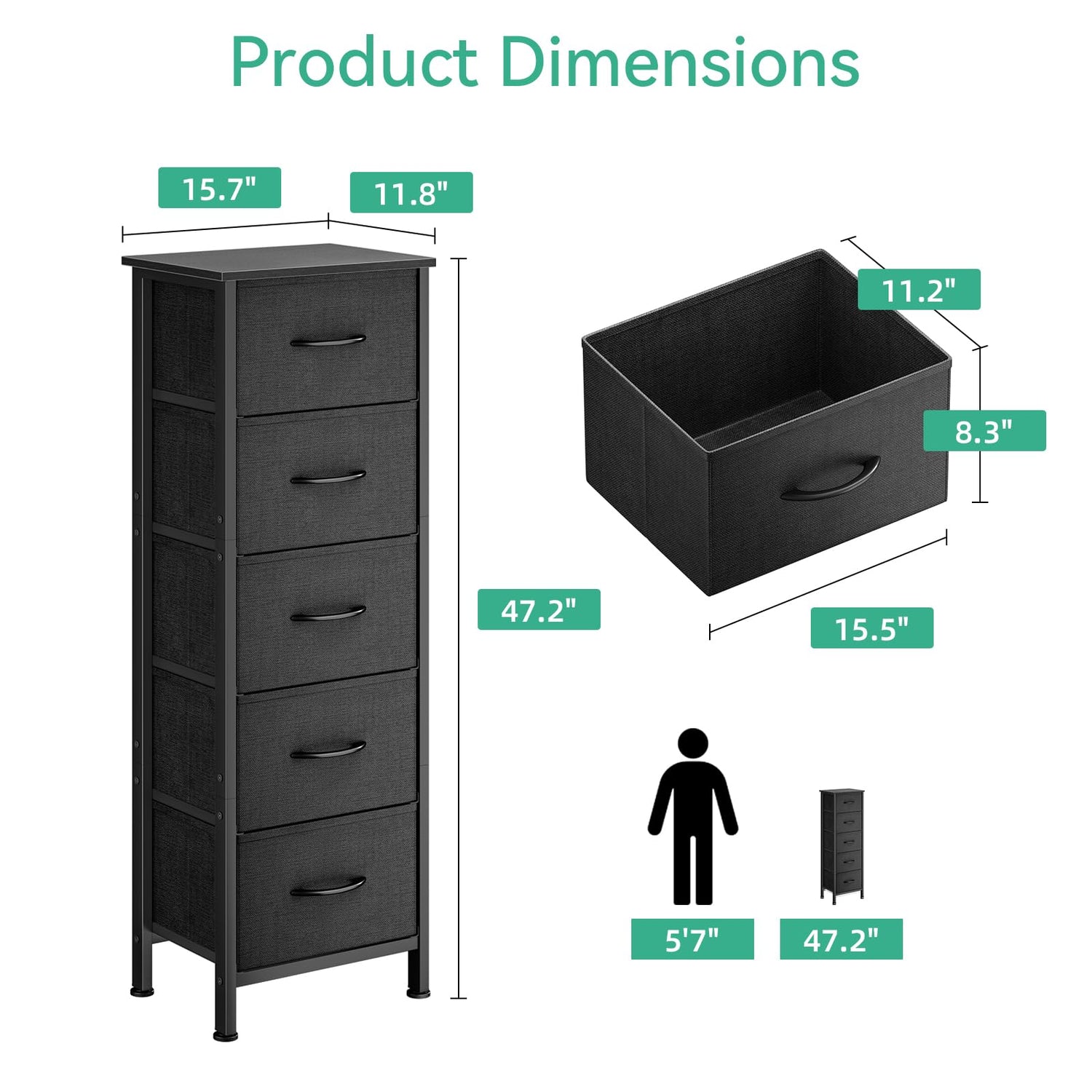- Large-size Design: This tall dresser is designed with spacious dimensions of 11.8"D x 15.7"W x 47.2"H, offering ample storage space for all your belongings