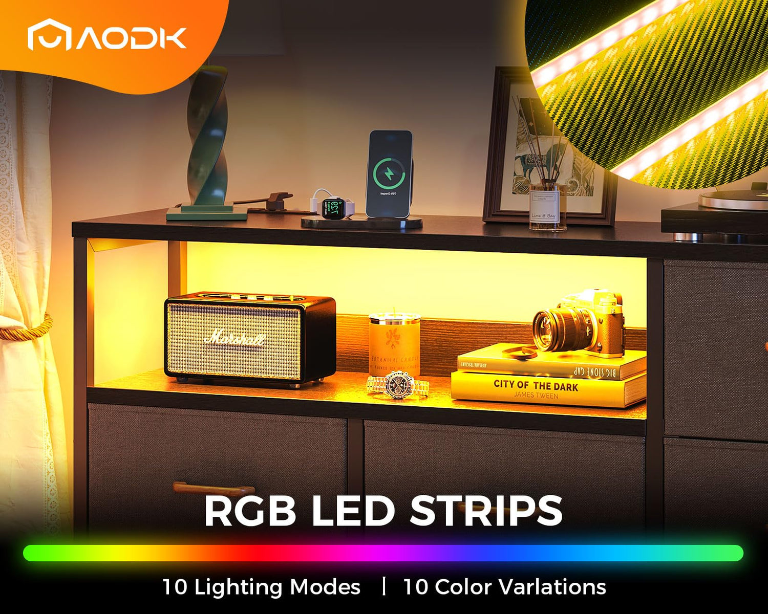 - 【LED Lights】This dresser TV stand boasts stunning LED lights, providing a choice of 10 colors, 28 flicker modes, and 8 adjustable brightness levels. It effortlessly adjusts to any setting, crafting the ideal ambiance for any space