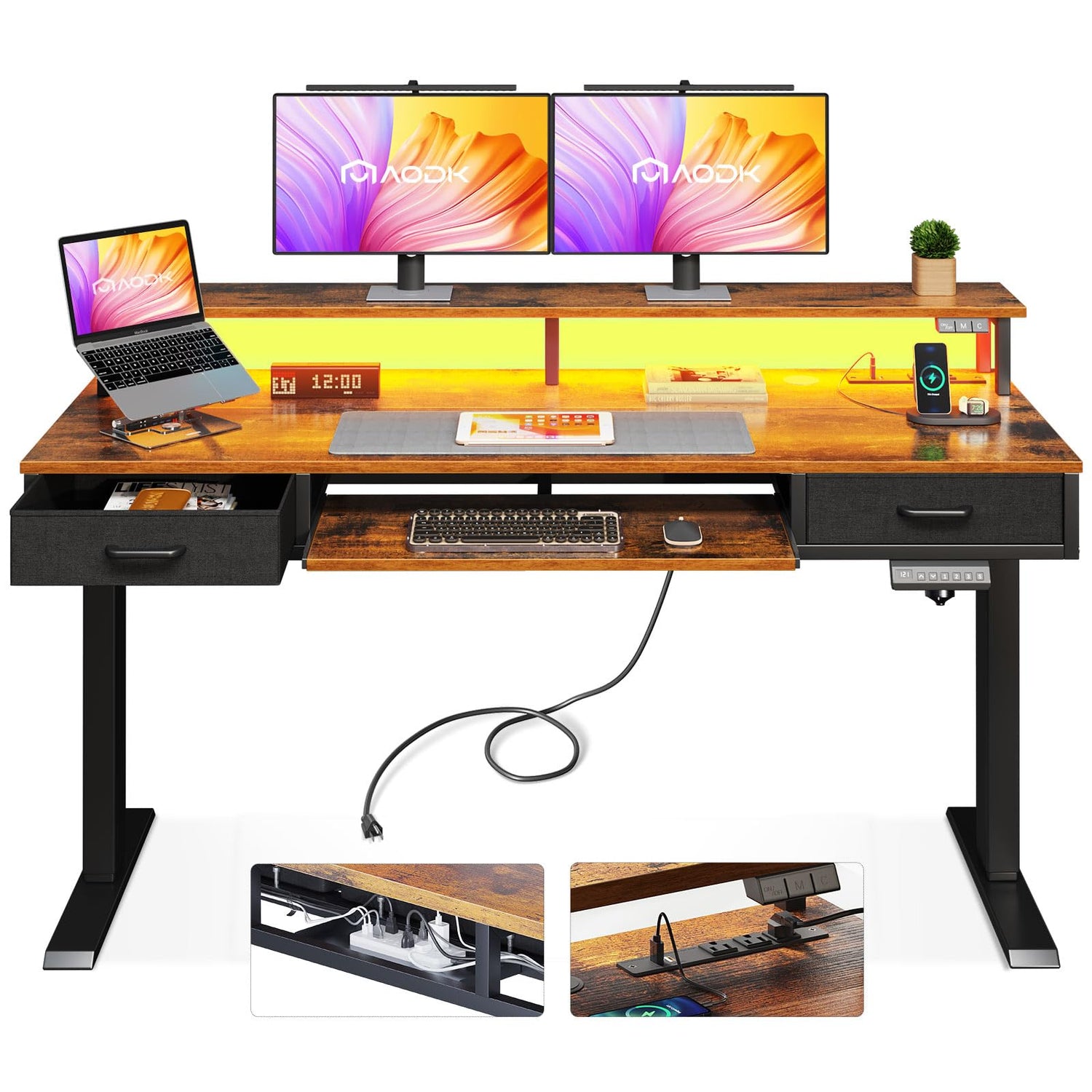 AODK Electric Standing Desk with 2 Drawers & Keyboard Tray and USB & LED Lights, 55inch Rustic Brown, Height Adjustable Desk with Power Outlets & LED Lights, Stand Up Desk with Monitor Shelf