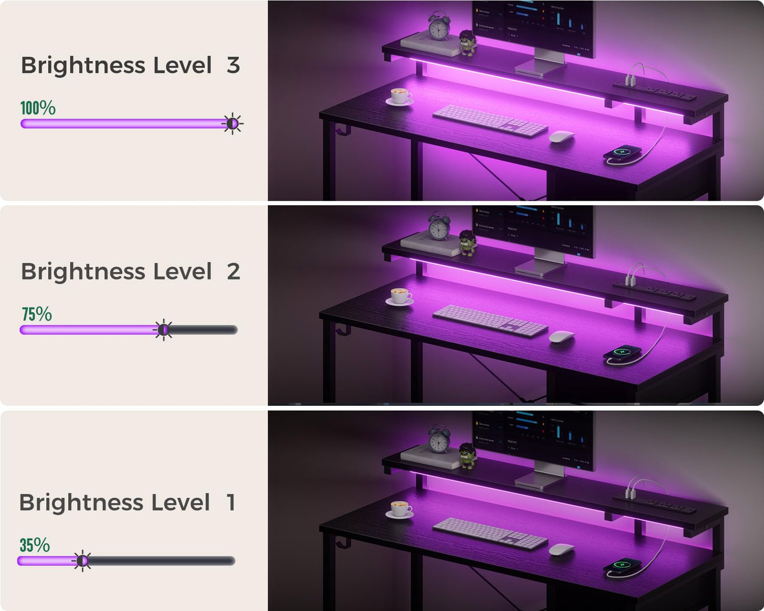 - 【Desk with LED Lights】Our gaming desk is equipped with a RGB LED strip lights under its monitor shelf which offers 10 static colors and 10 dynamic modes. You can freely switch between different lighting colors by pressing the button, according to your mood or the specific usage scenario. Whether you are gaming, live streaming, or daily working, it adds a vibrant atmosphere to your room, enhancing your overall experience.