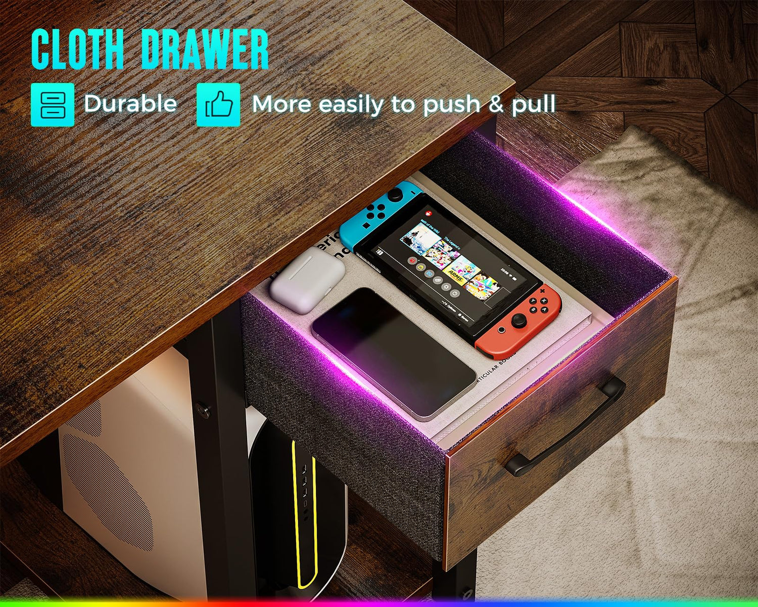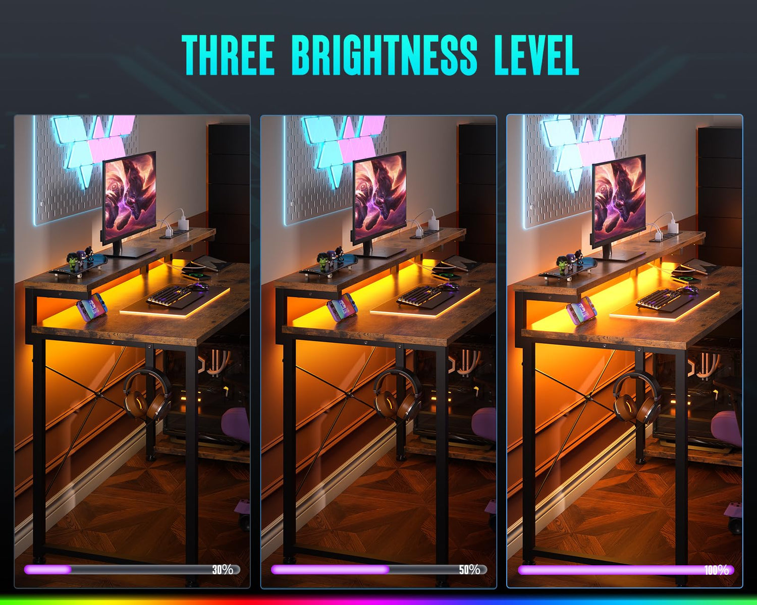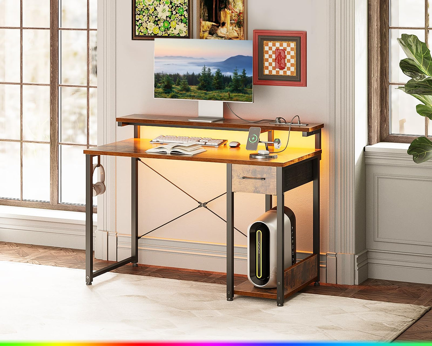 AODK Gaming Desk with LED Lights & Power Outlet, 40 Inch Small Computer Desk with Drawer, Reversible Desk with Adjustable Monitor Shelf & Headphone Hook for Home Office, Rustic Brown