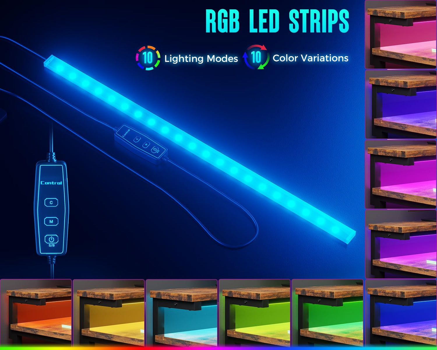 - 【Desk with LED Lights】Our gaming desk is equipped with a RGB LED strip lights under its monitor shelf which offers 10 static colors and 10 dynamic modes. You can freely switch between different lighting colors by pressing the button, according to your mood or the specific usage scenario. Whether you are gaming, live streaming, or daily working, it adds a vibrant atmosphere to your room, enhancing your overall experience.