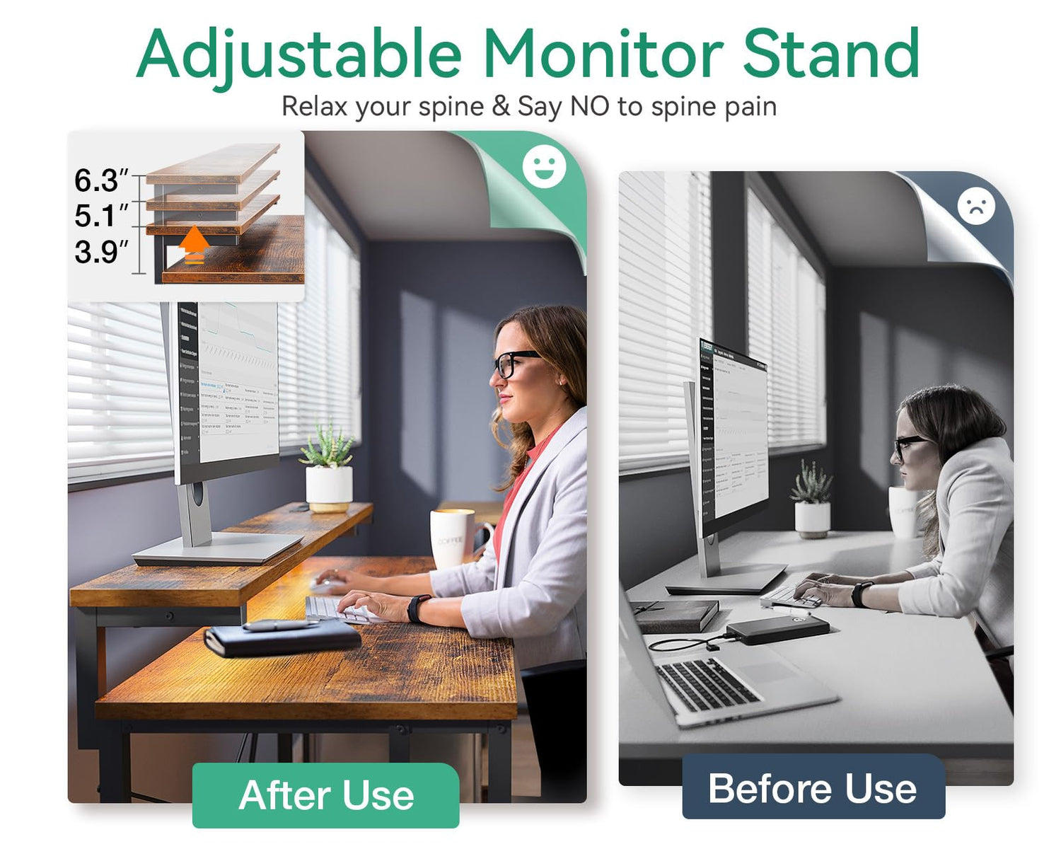 - 【Adjustable Monitor Shelf】The desk is designed with adjustable monitor shelf which can be adjusted to three heights (3.9''/5.1''/6.3'') to suit your sitting posture. The ergonomic design ensures that you can view the screen directly, reducing neck or spine fatigue during work. Moreover, it can support two monitors.