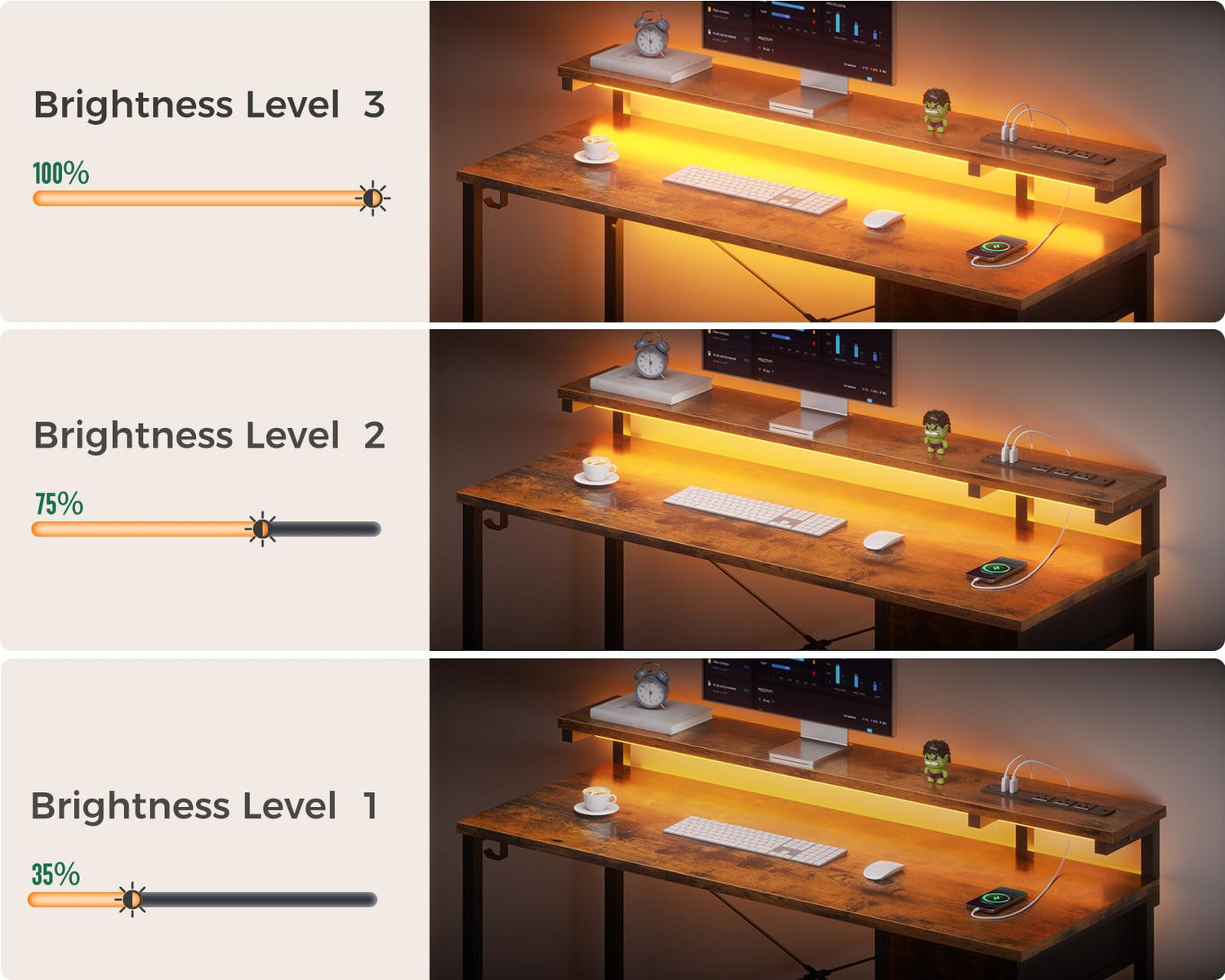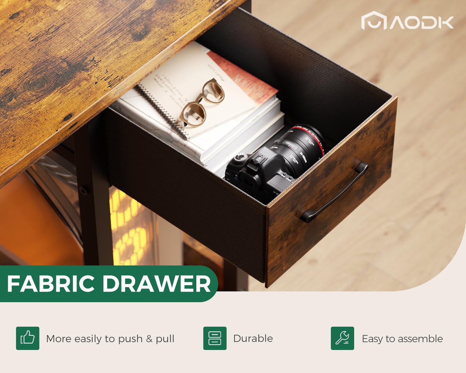 AODK Gaming Desk with LED Lights & Power Outlet, 48 Inch Computer Desk with Drawer, Reversible Desk with Adjustable Monitor Shelf & Headphone Hook for Home Office, Rustic Brown