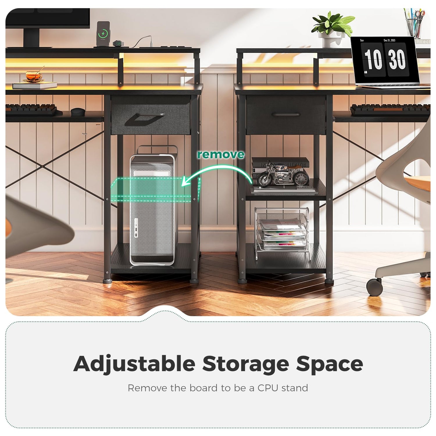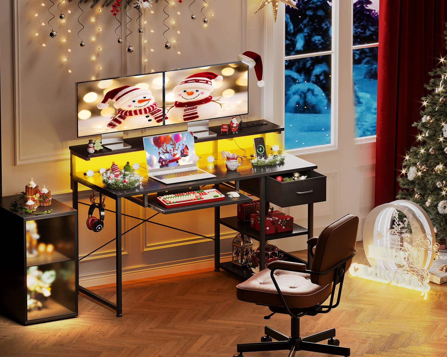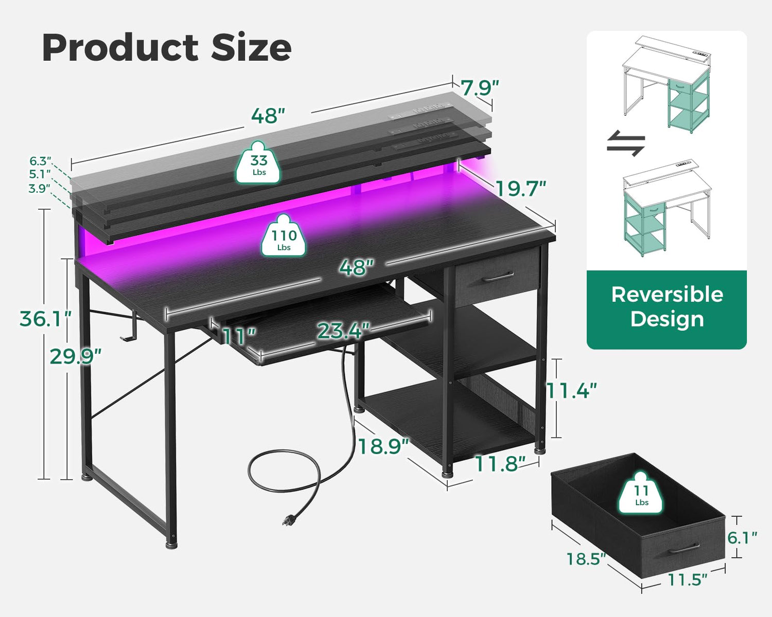AODK Gaming Desk with LED Lights & Power Outlet, 48 Inch Computer Desk with Keyboard Tray, Office Desk with Drawer, Reversible Desk with Adjustable Monitor Shelf and Storage Shelf, Black