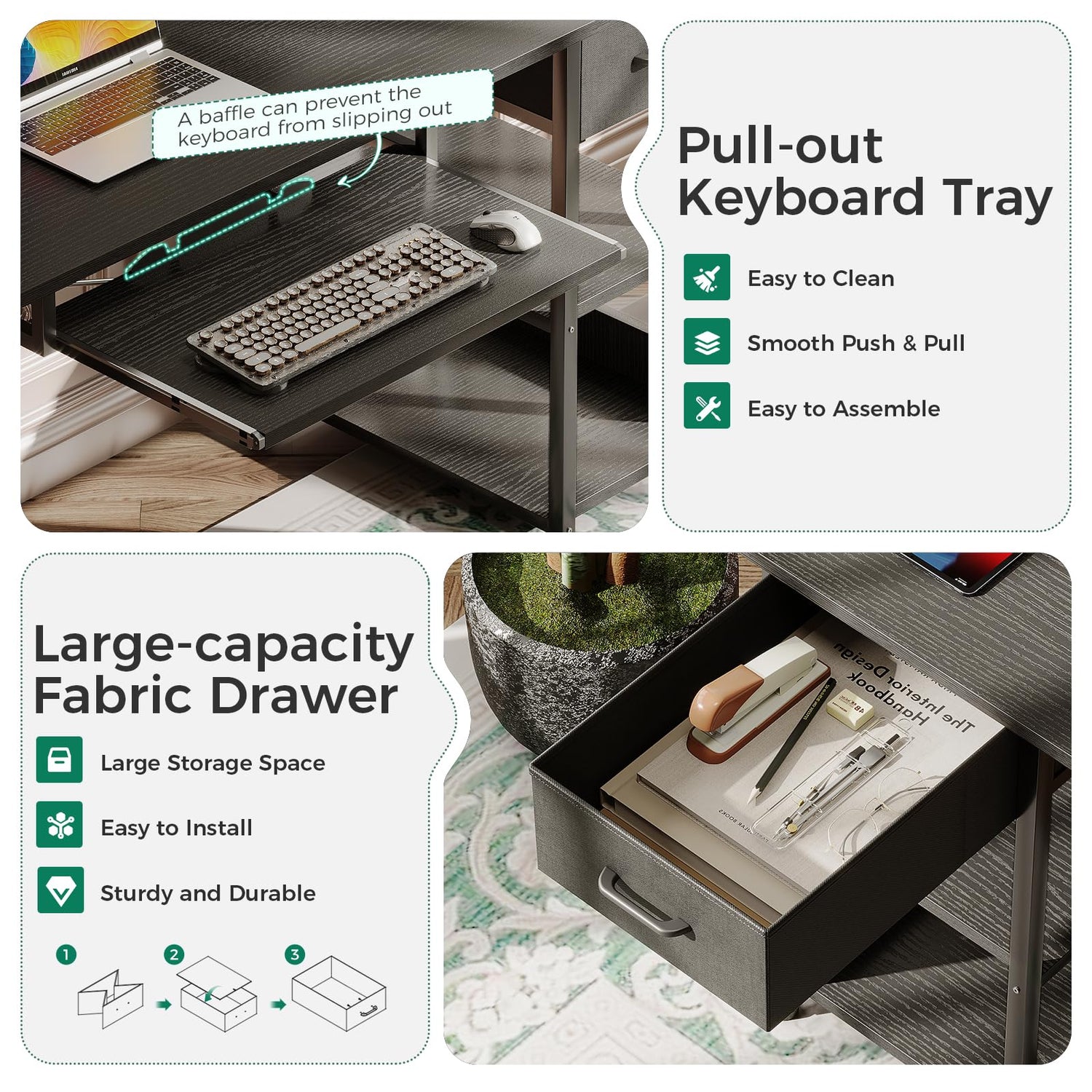 - Pull-out Keyboard Tray & Fabric Drawer: This desk is equipped with a keyboard tray and one drawer. The pull-out keyboard tray suits for full size 108 Keys keyboard or 87 Keys keyboard adding mouse. A baffle on it can prevent the keyboard from slipping out. The Drawer made of fabric is ready to use and easy to clean. It offers a private space for storaging your goods.