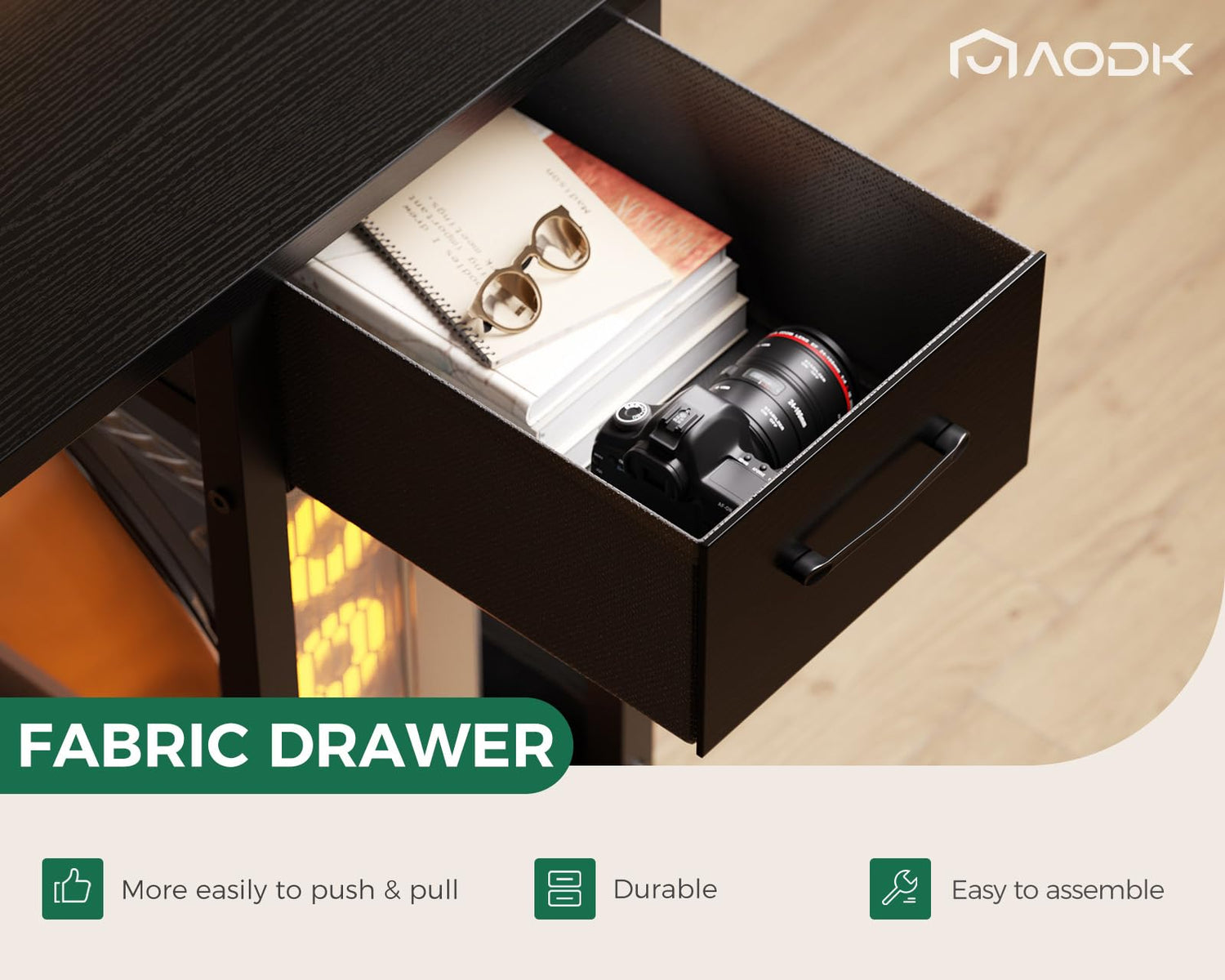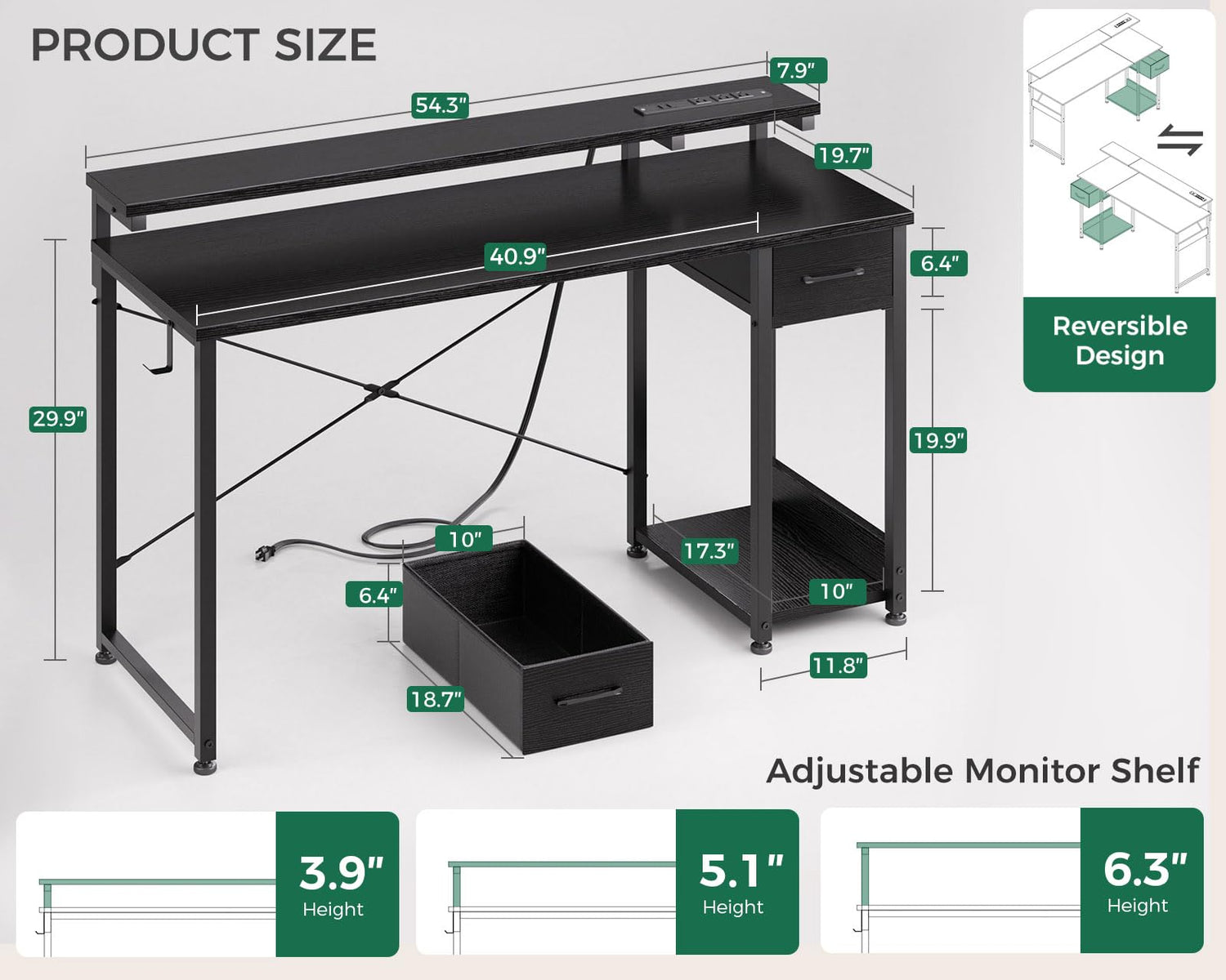 - 【Fabric Drawer & Reversible PC stand】The drawer made of fabric is ready to use and easy to clean. It offers a private space for storaging your goods. The shelf below the desktop can be assembled at left or right for your convenience. A headphone hook is equipped on the other side of the desk.