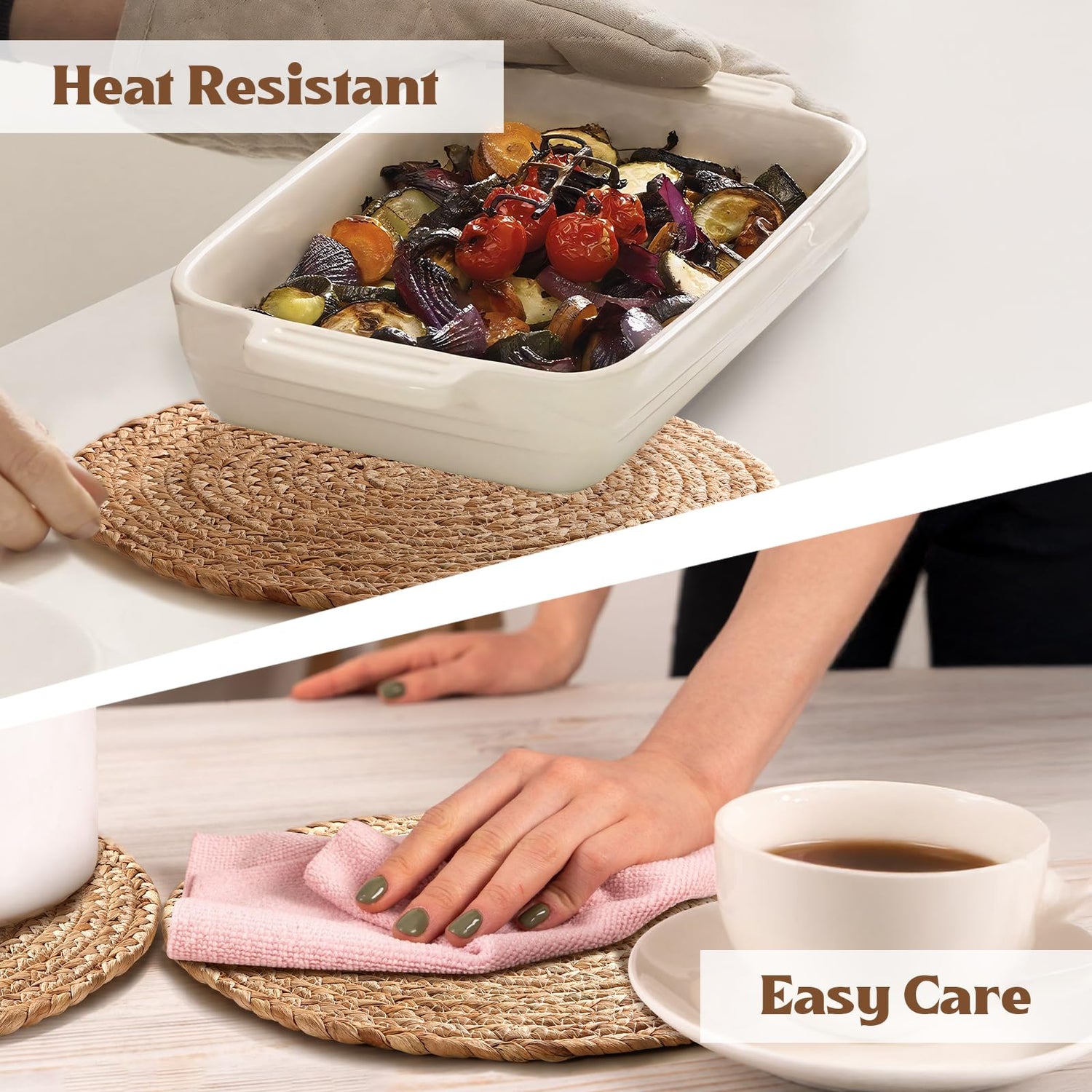- đşEASY TO MAINTAIN & BUILT TO LAST: Cleaning these rattan place mats couldnât be easierâjust wipe them down with a damp cloth or sponge and let them air dry. The thick, braided design is tough enough to protect your table, yet soft enough to enhance your dining experience. Crafted to last, they wonât fade or lose their charm after repeated use. Their easy-to-clean nature makes them a practical choice for busy homes, ensuring they look as beautiful as the first day you meet them.