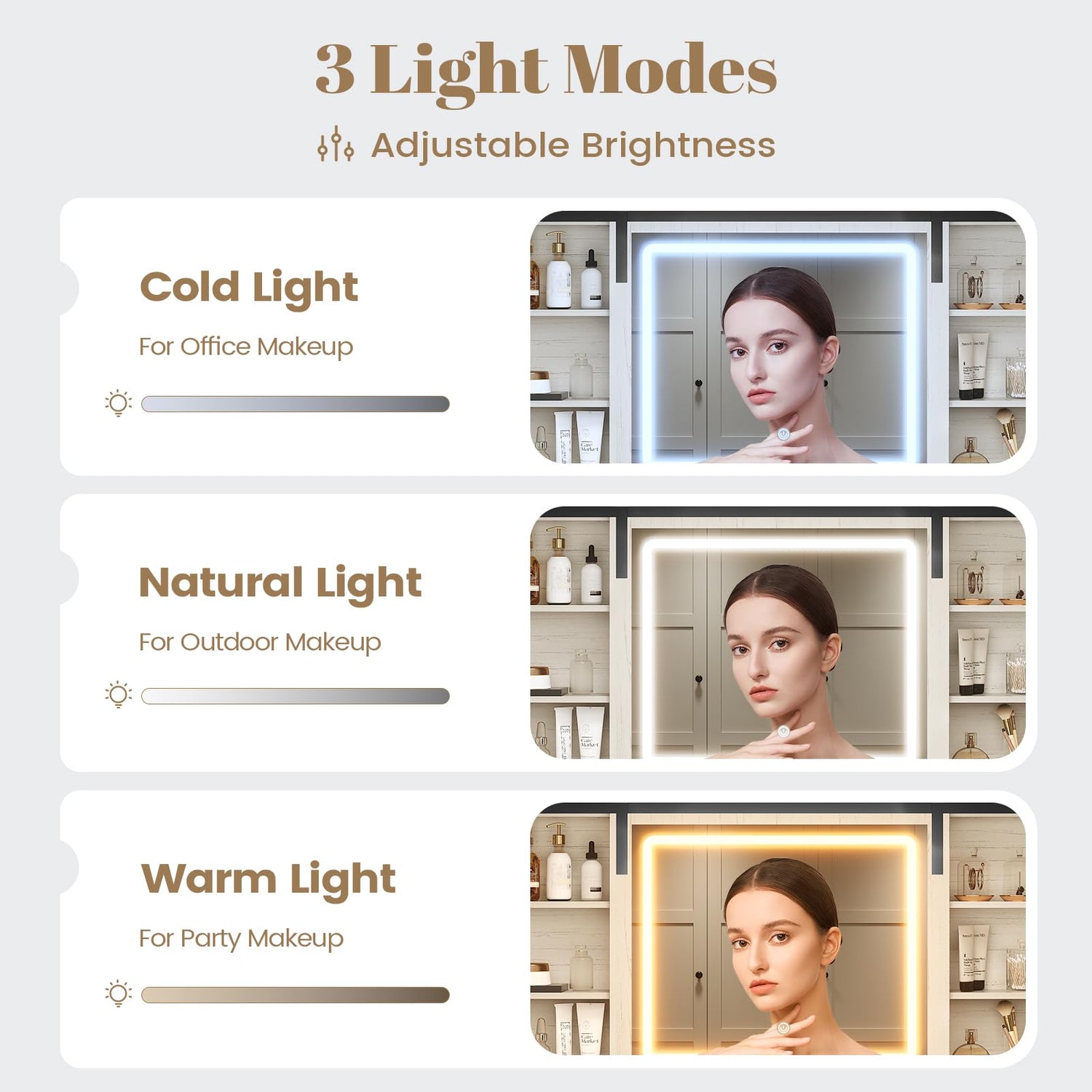 - 🎖️【3 Lighting Modes & Brightness Adjustable】The makeup desk is equipped with a large mirror and built-in LED light, offering 3 different color modes (warm yellow, warm white, and cool white) to provide soft and non-glare light. The brightness can be adjusted by long pressing the button to meet different brightness needs, creating the perfect lighting when applying makeup or hair styling, and avoiding blinding light