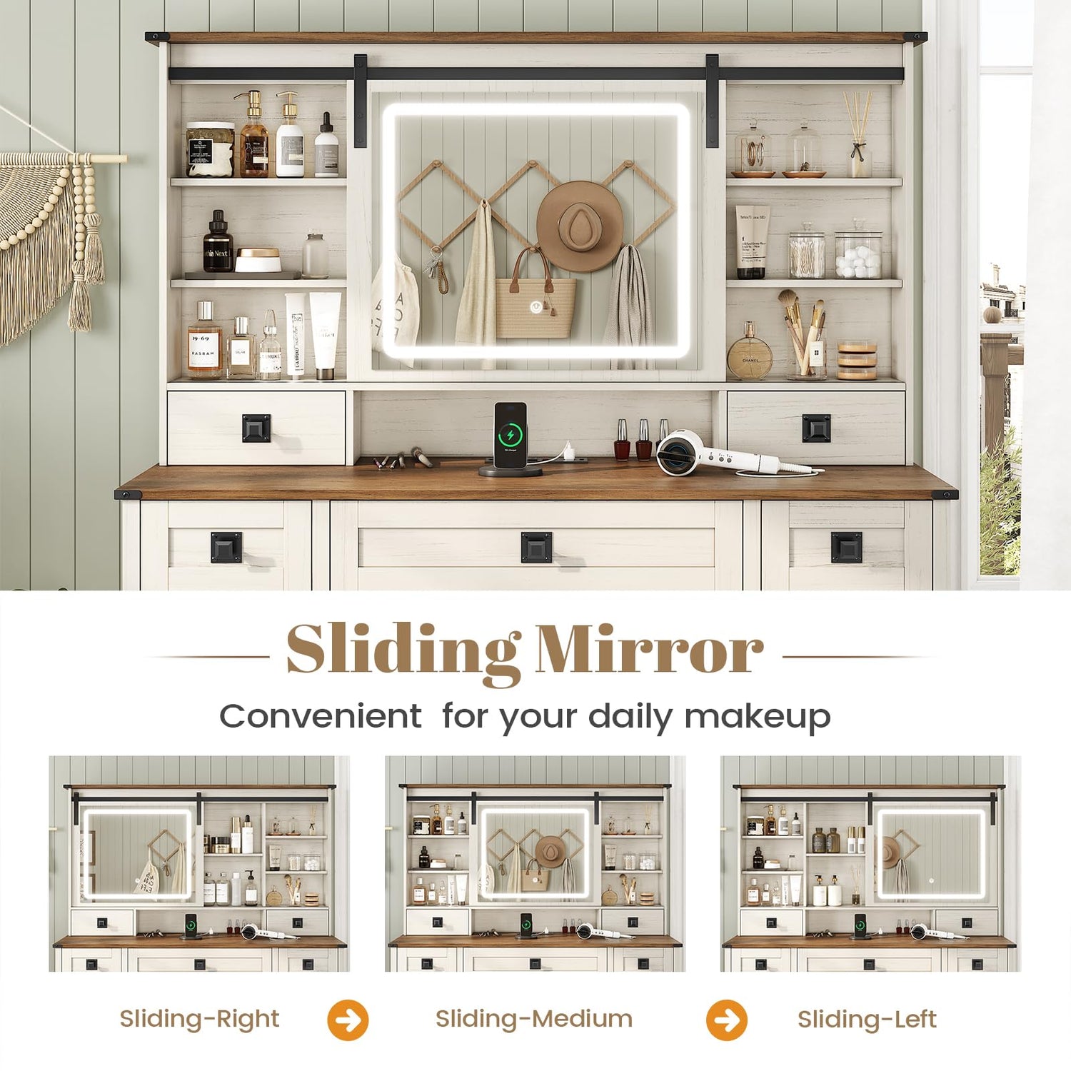 AOGLALTI Farmhouse Vanity Desk with Mirror and Lights, Makeup Vanity with Lights & Charging Station, Large White Vanity Table with Ample Storage Space and Sliding Mirror (White)