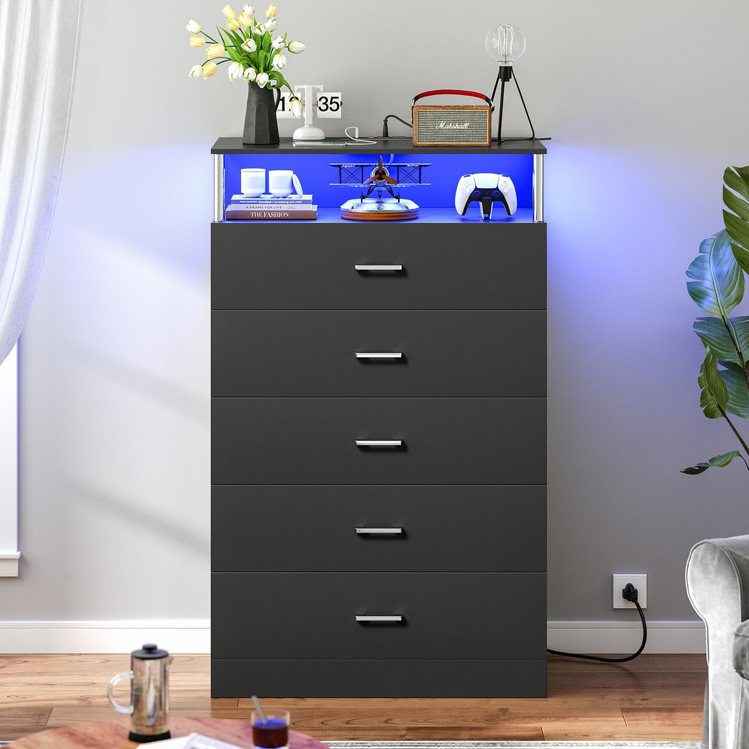 - *️⃣【Convenient Charging Station】The chest of drawers is arranged with 2 AC and 2 USB socket. One of USB ports is designed for the led lights, the AC socket and the other USB socket provide convenience for charging your phone, earphone, desk lamp, and other small electrical appliances. And the chest of drawers for bedroom is convenient for charging devices in any room, be it in the bedroom or living room.