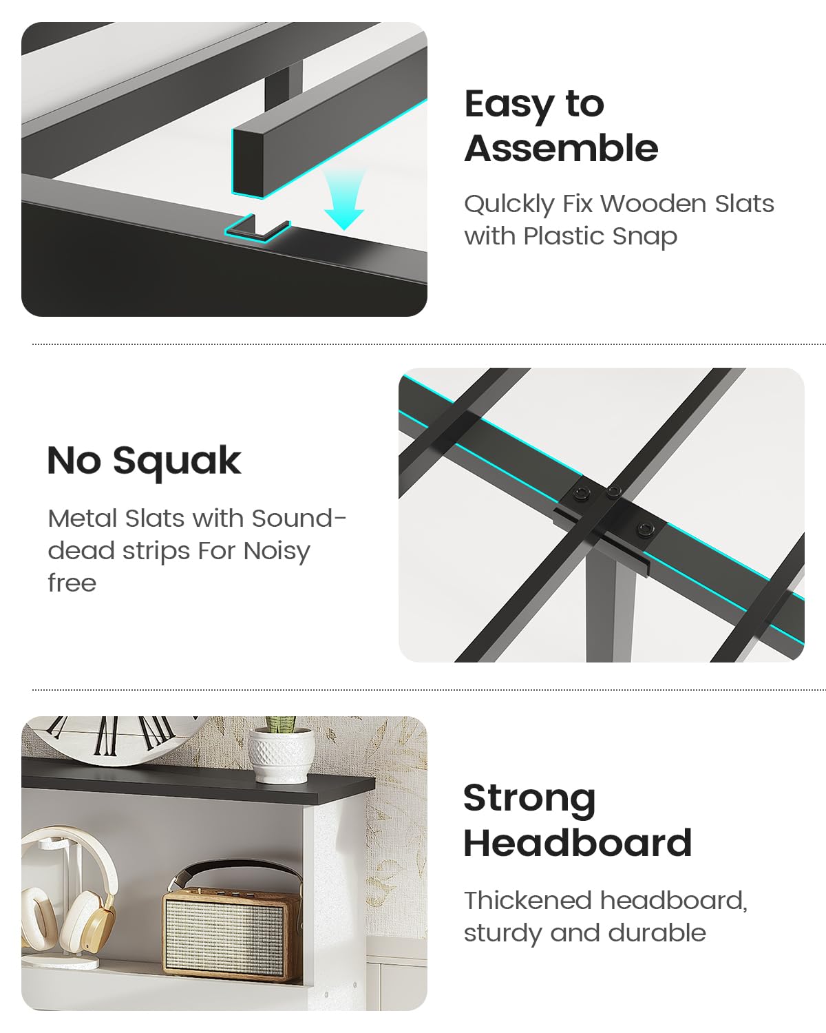 - 【Stable Frame and Easy Assemble】The king bed frame and headboard with stable wooden slats supports to ensure the stability and durability, providing a strong sense of security.The instructions of the queen bed frame. It has detailed instructions for each step, you can assemble the bed frame sufficient easily.