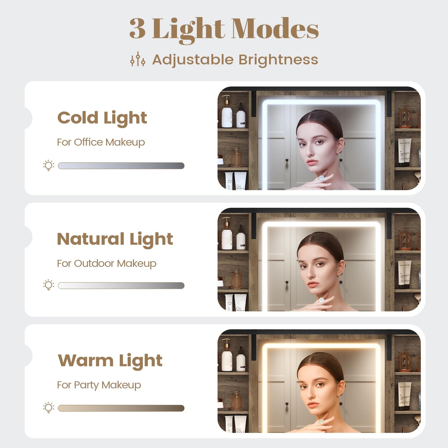 - 【3 Lighting Modes & Brightness Adjustable】The makeup desk is equipped with a large mirror and built-in LED light, offering 3 different color modes (warm yellow, warm white, and cool white) to provide soft and non-glare light. The brightness can be adjusted by long pressing the button to meet different brightness needs, creating the perfect lighting when applying makeup or hair styling, and avoiding blinding light.