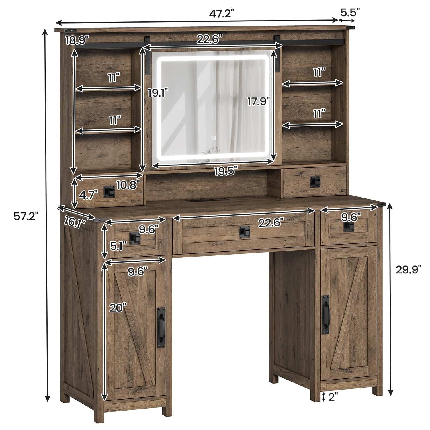 - 【Vanity with Ample Storage Space】This farmhouse vanity has generous storage space for all your beauty essentials, including 2-tier shelves hidden behind the mirror, 6 storage shelves, 1 large drawer, 2 medium drawers, 2 extra tabletop drawers, and 2 storage cabinets. You can store all your cosmetics and beauty products such as eyeliners, cosmetics, nail polish,jewelry, and so on. The spacious tabletop provides extra space for your favorite hair accessories, hair care products, and cosmetics.